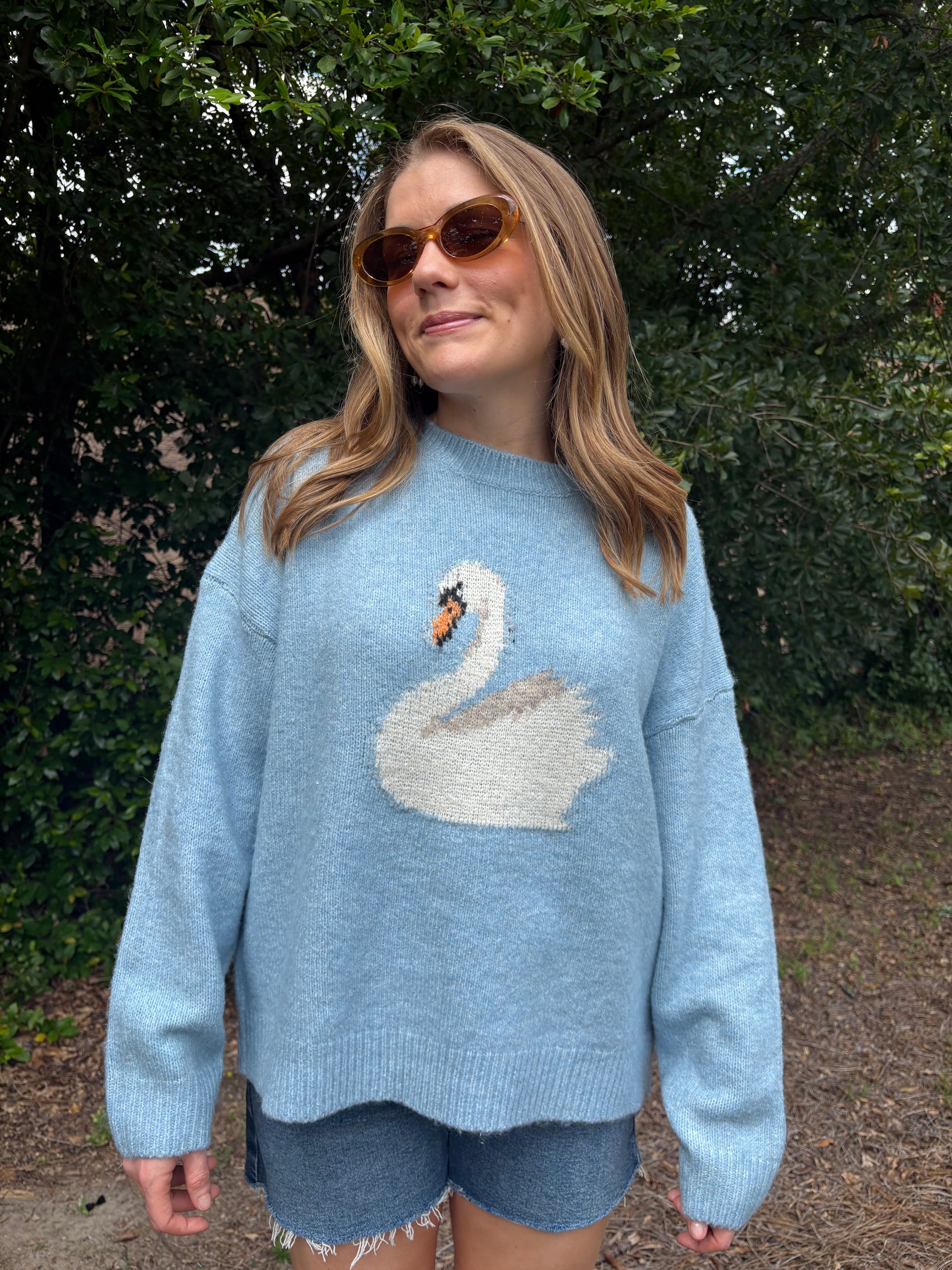 Daisy blue sweater with swan design. Relaxed fit, intentionally oversized.