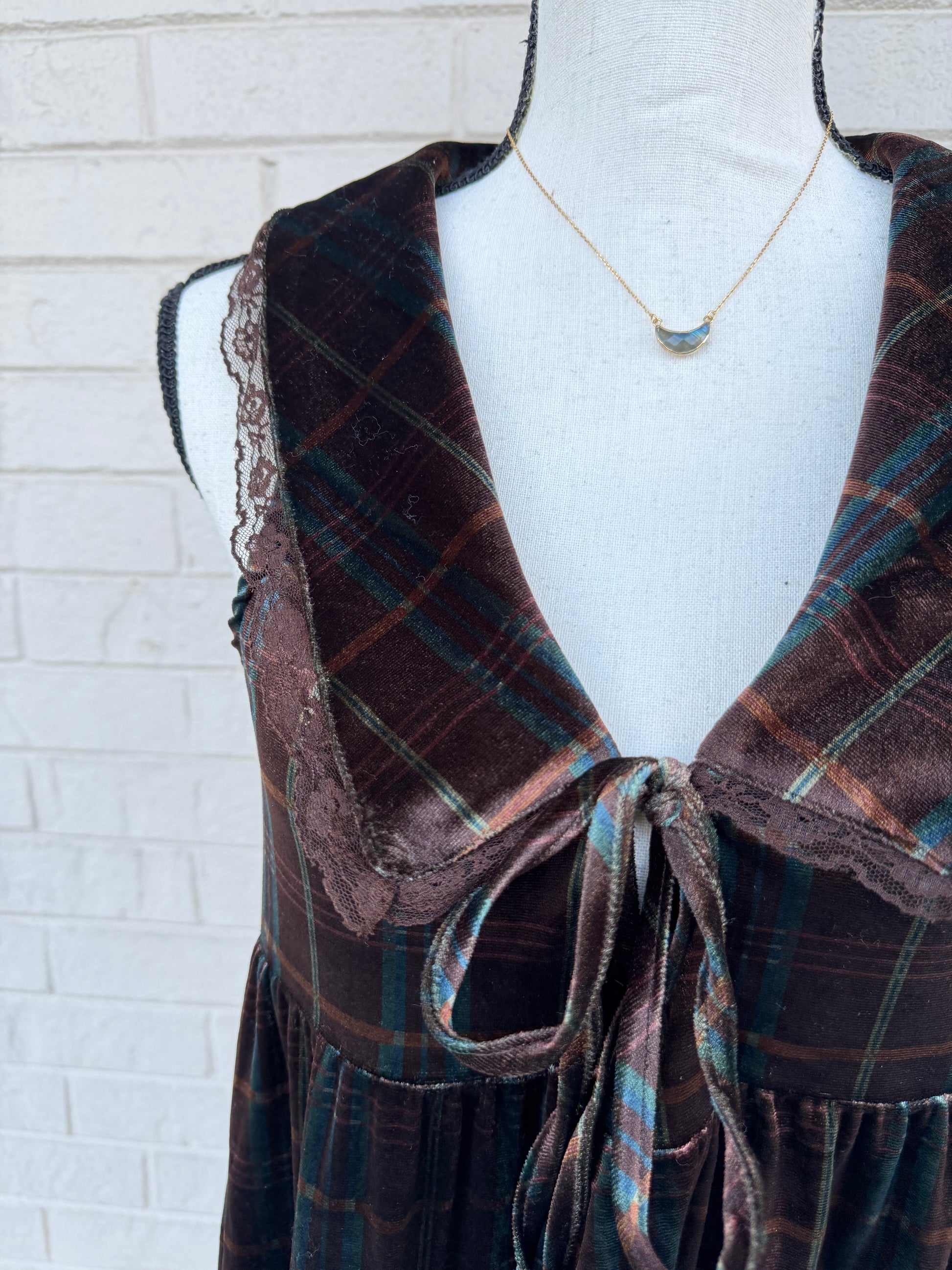 Brown velvet plaid mini dress with collar, front tie, and lace detail.