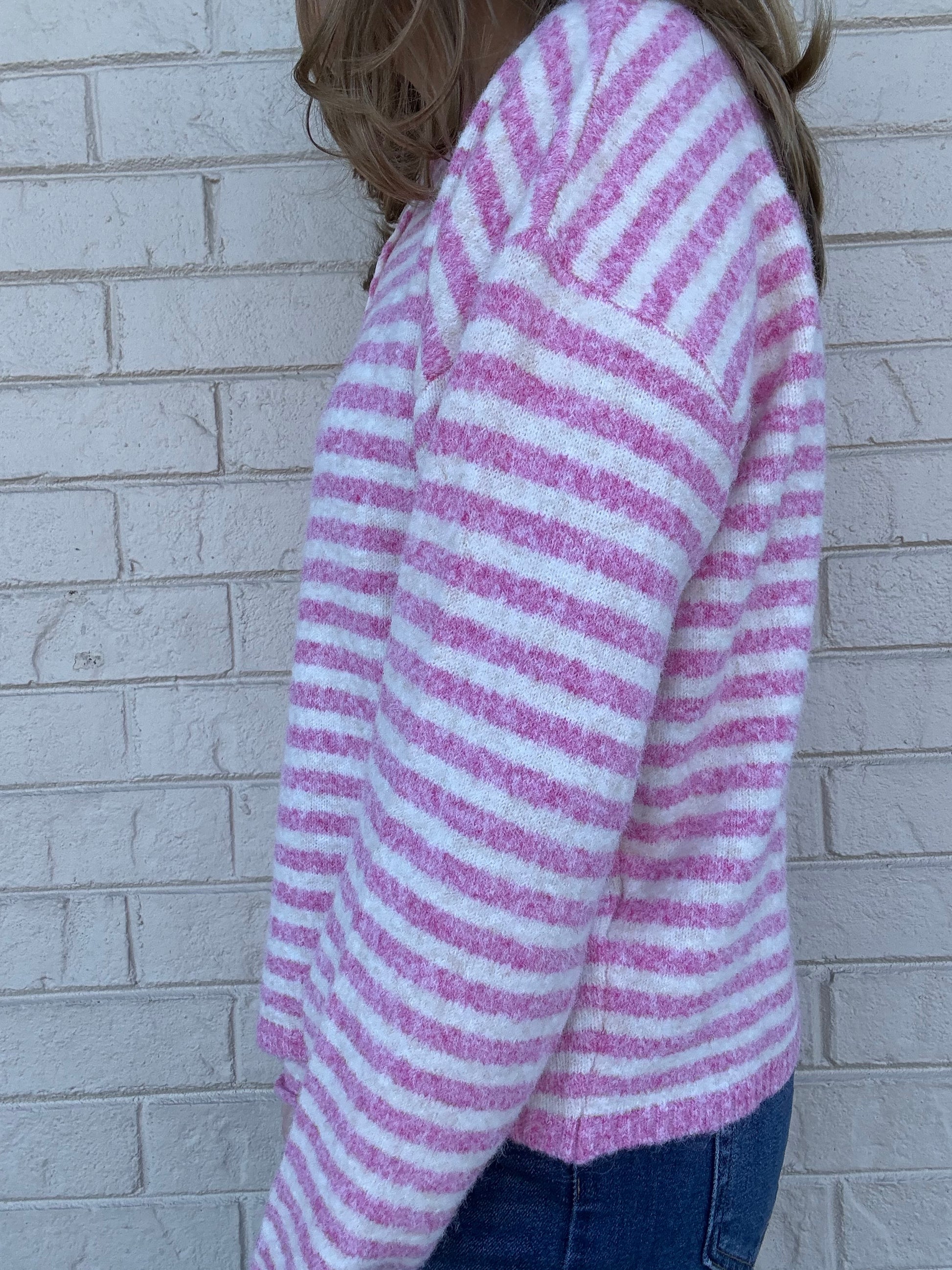 The viral soft and cozy lightweight henley cardigan in striped bubblegum pink is here! The Henley Piper Cardigan by Things Between is a versatile staple piece you'll never want to take off! See size chart in photos!