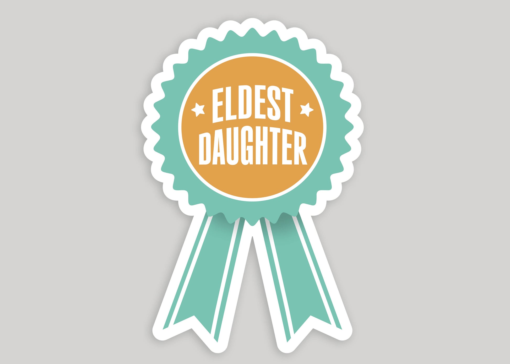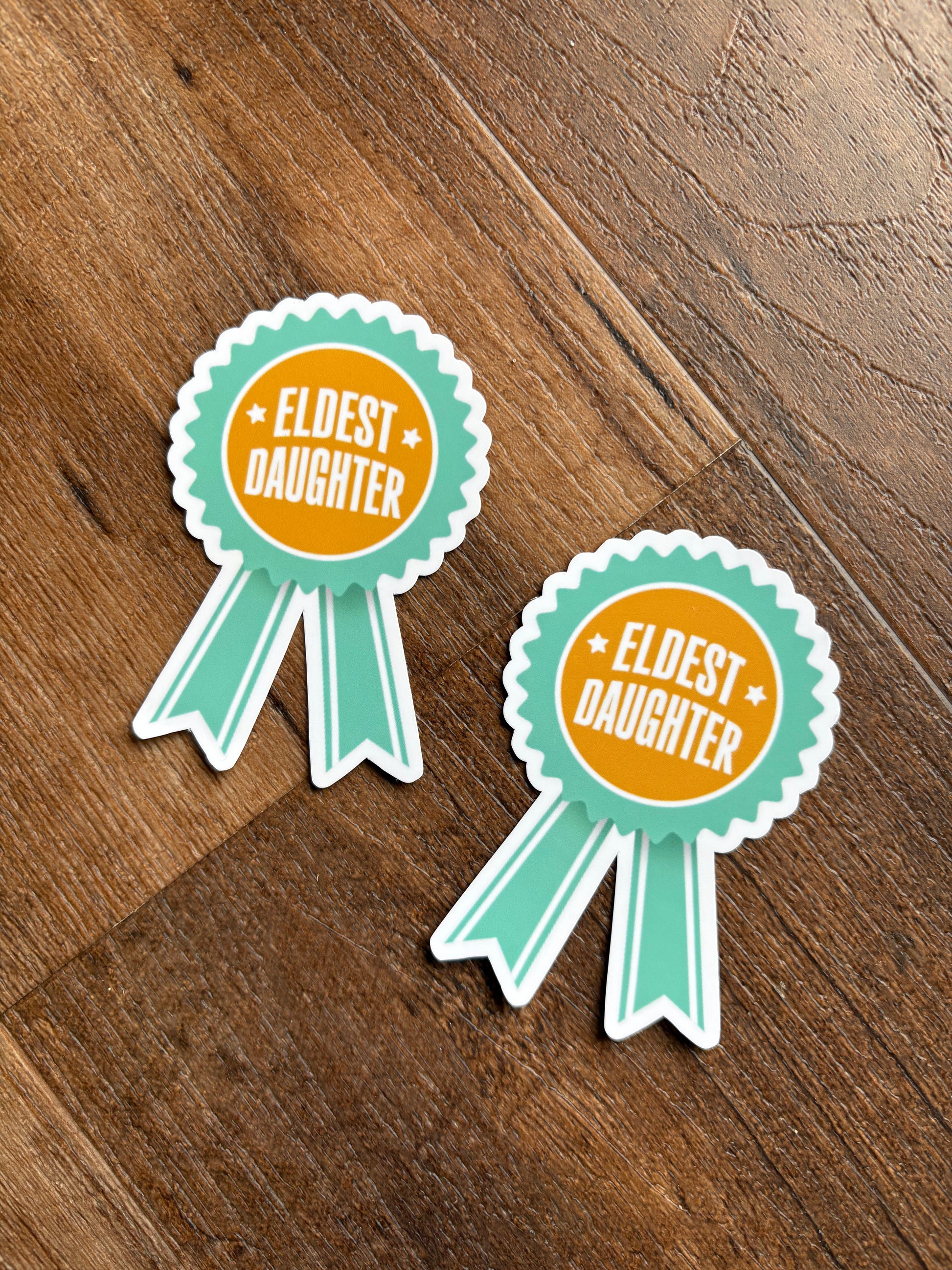 This fun sticker is perfect for your laptop, water bottle, notebook & more! This sticker has a teal ribbon award with a yellow center and reads "Eldest Daughter". This sticker is sized to 3.5 x 2.3 inches with a glossy, water-resistant coating.