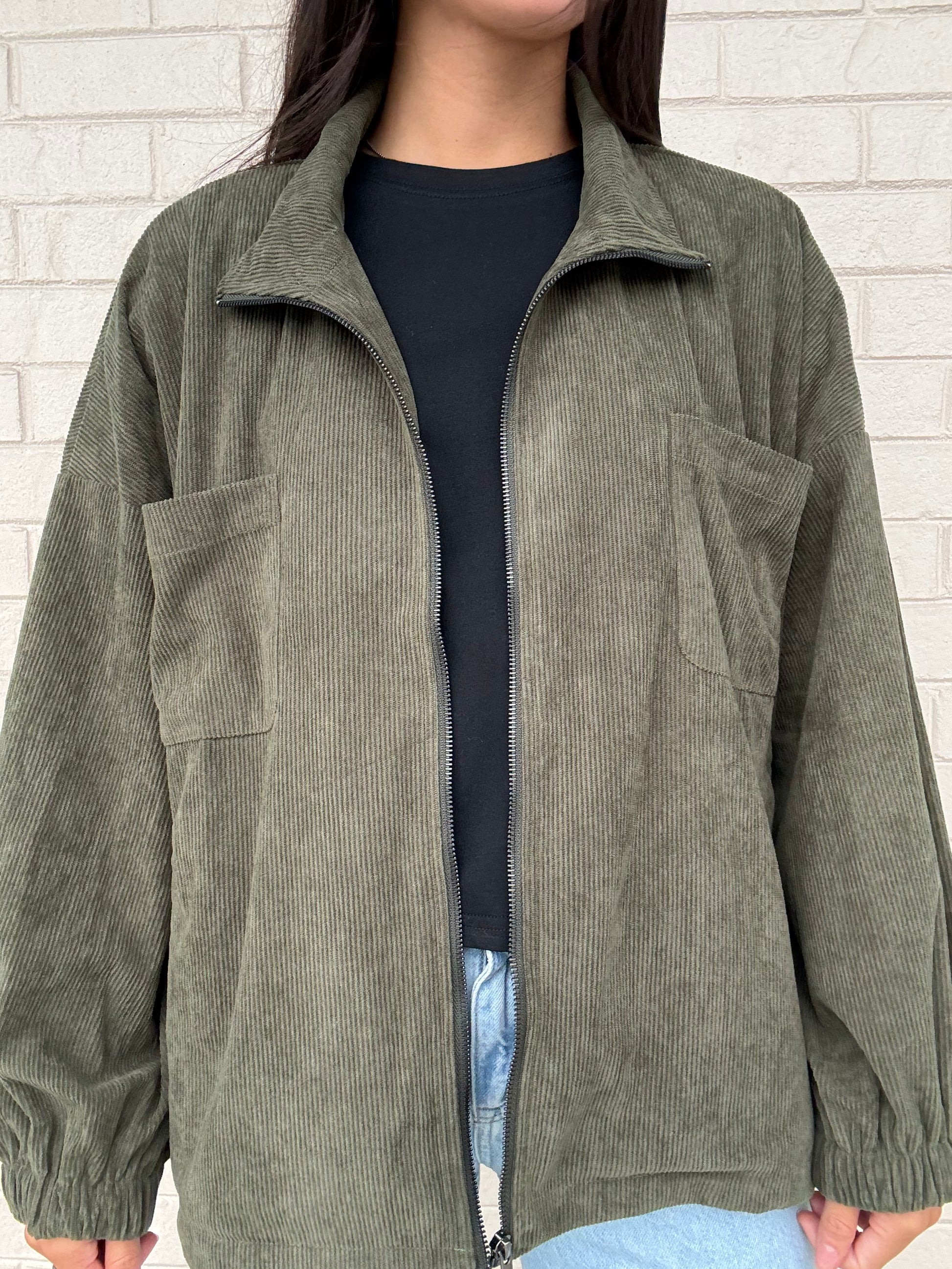 Oversized lapel corduroy zipper Jacket. Crafted from soft, textured corduroy, this jacket features a relaxed fit, a chic oversized lapel, and a smooth zipper closure for easy layering.