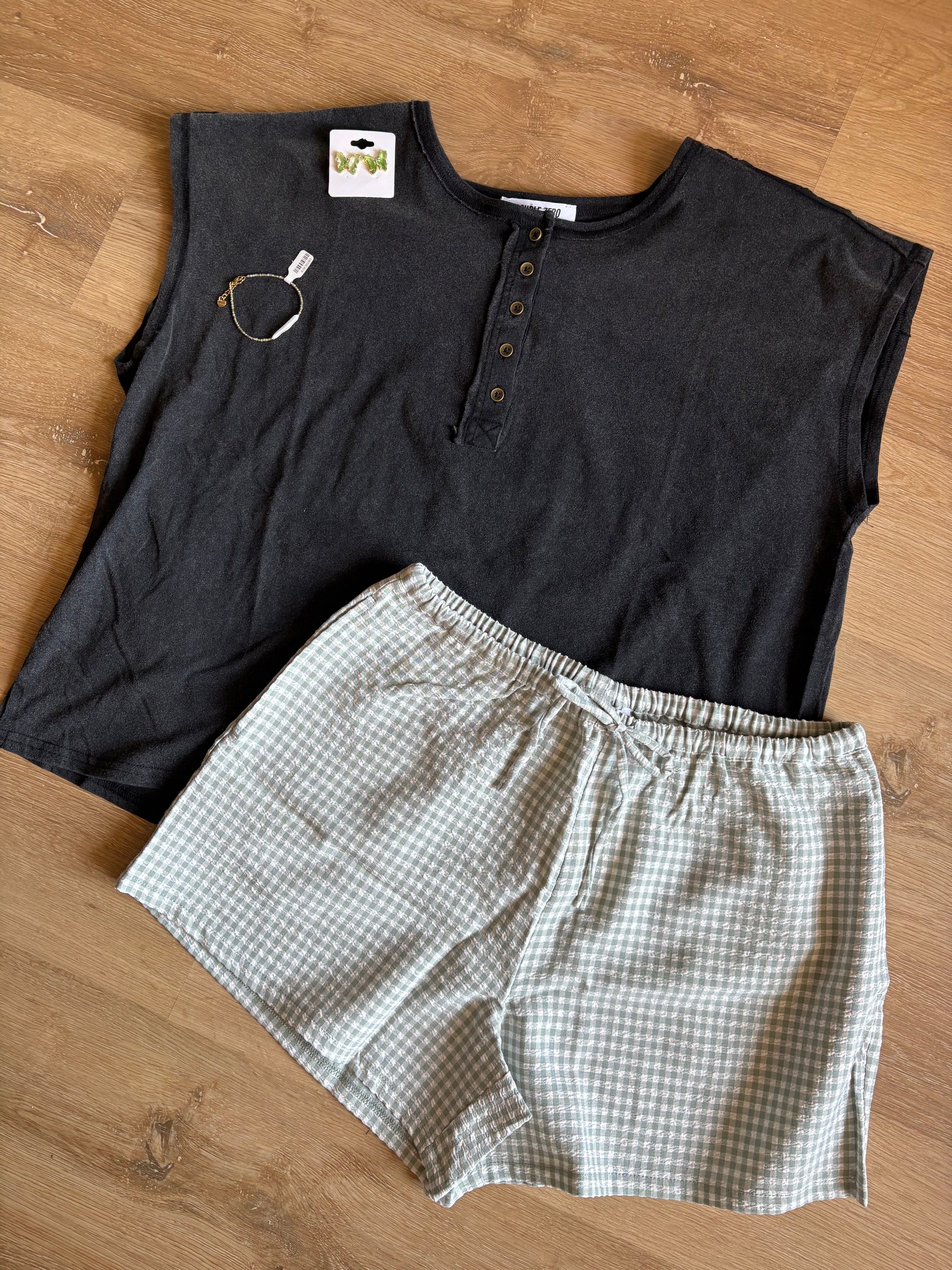 Henley cap sleeve top with a vintage wash.