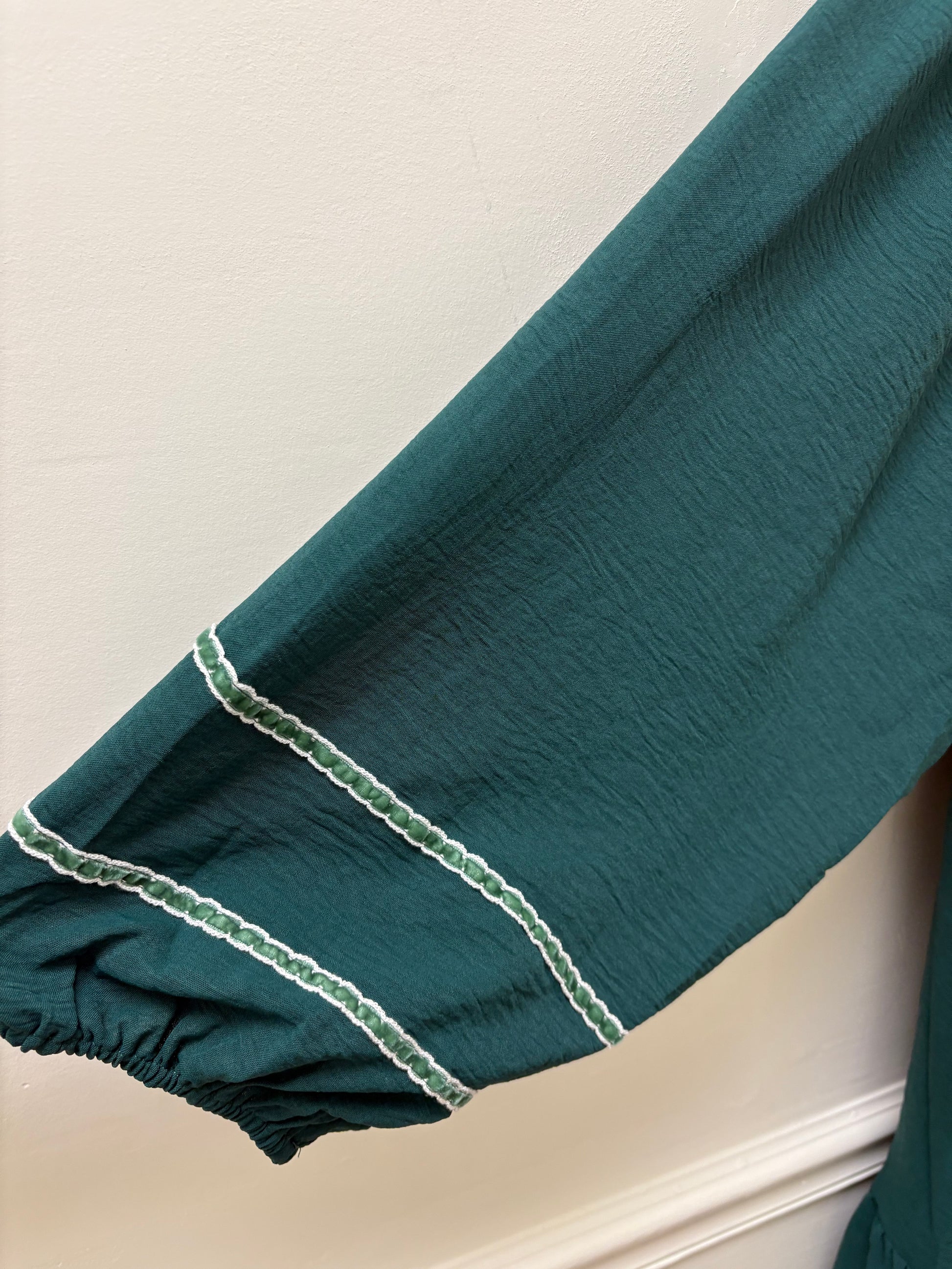 Hunter green smocked tiered mini dress with balloon sleeves.