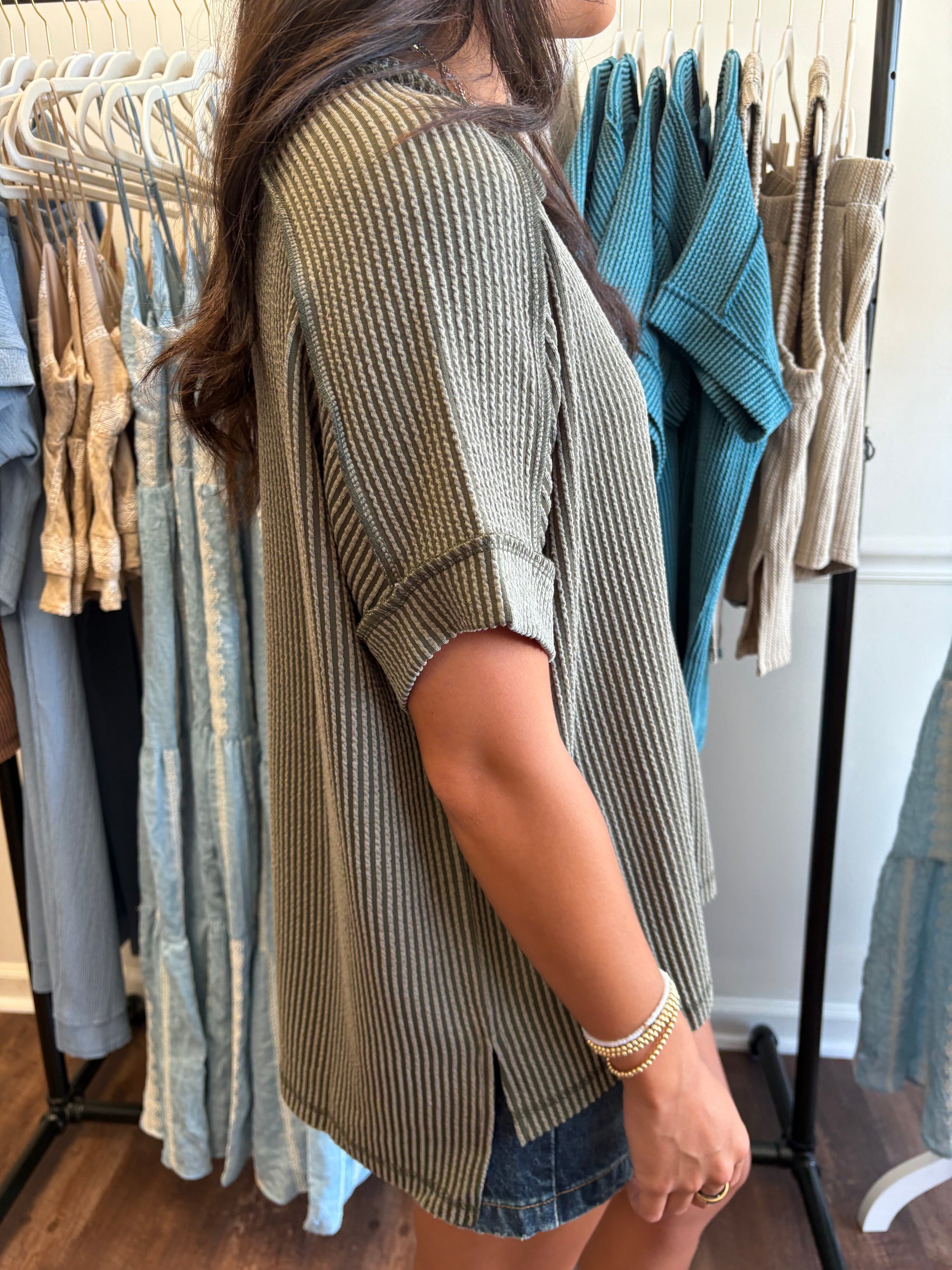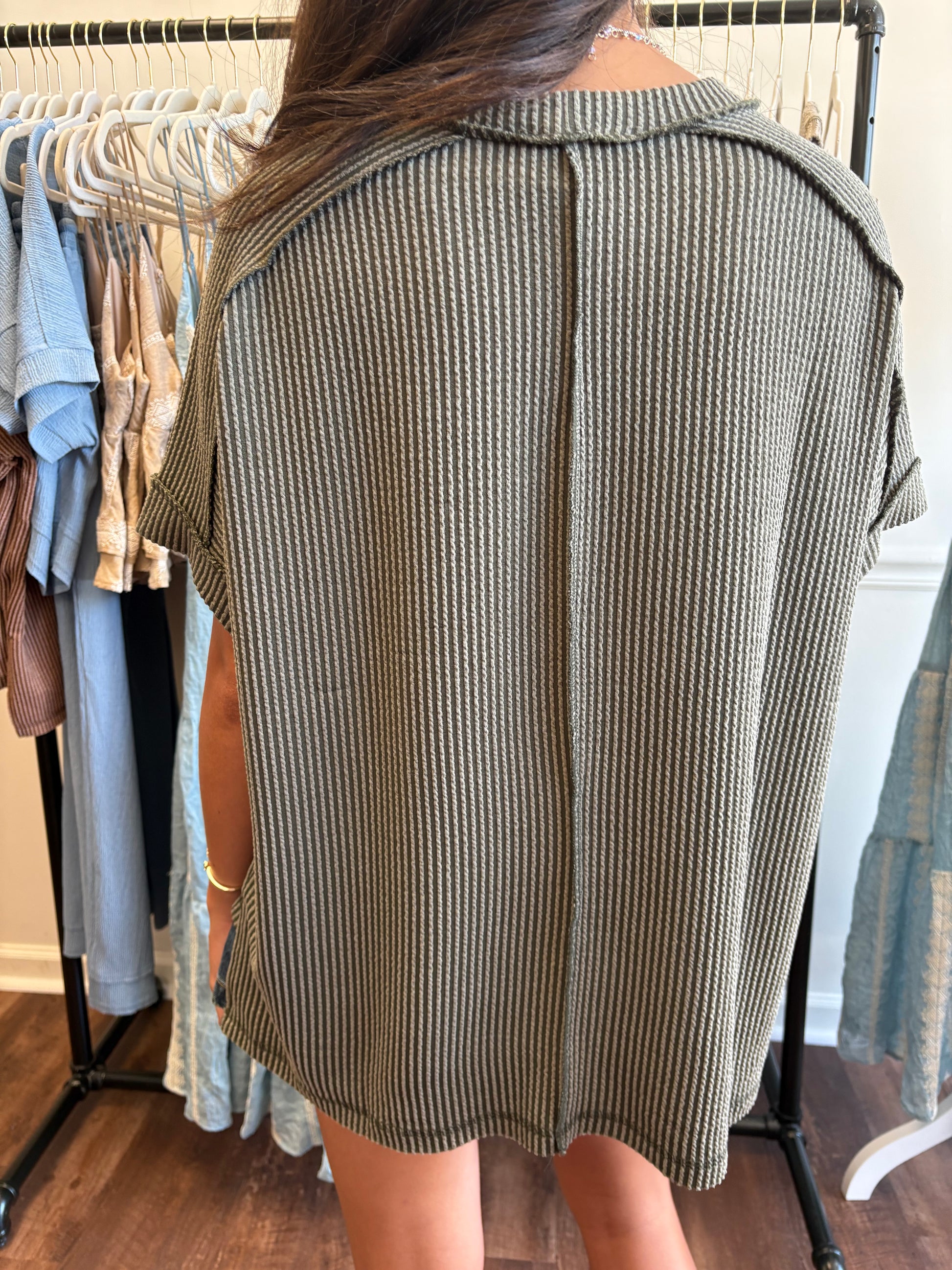 Olive raised rib short sleeve top! We love the wavy corded rib knit and lightweight feel. Relaxed fit and slightly shorter in the front.
