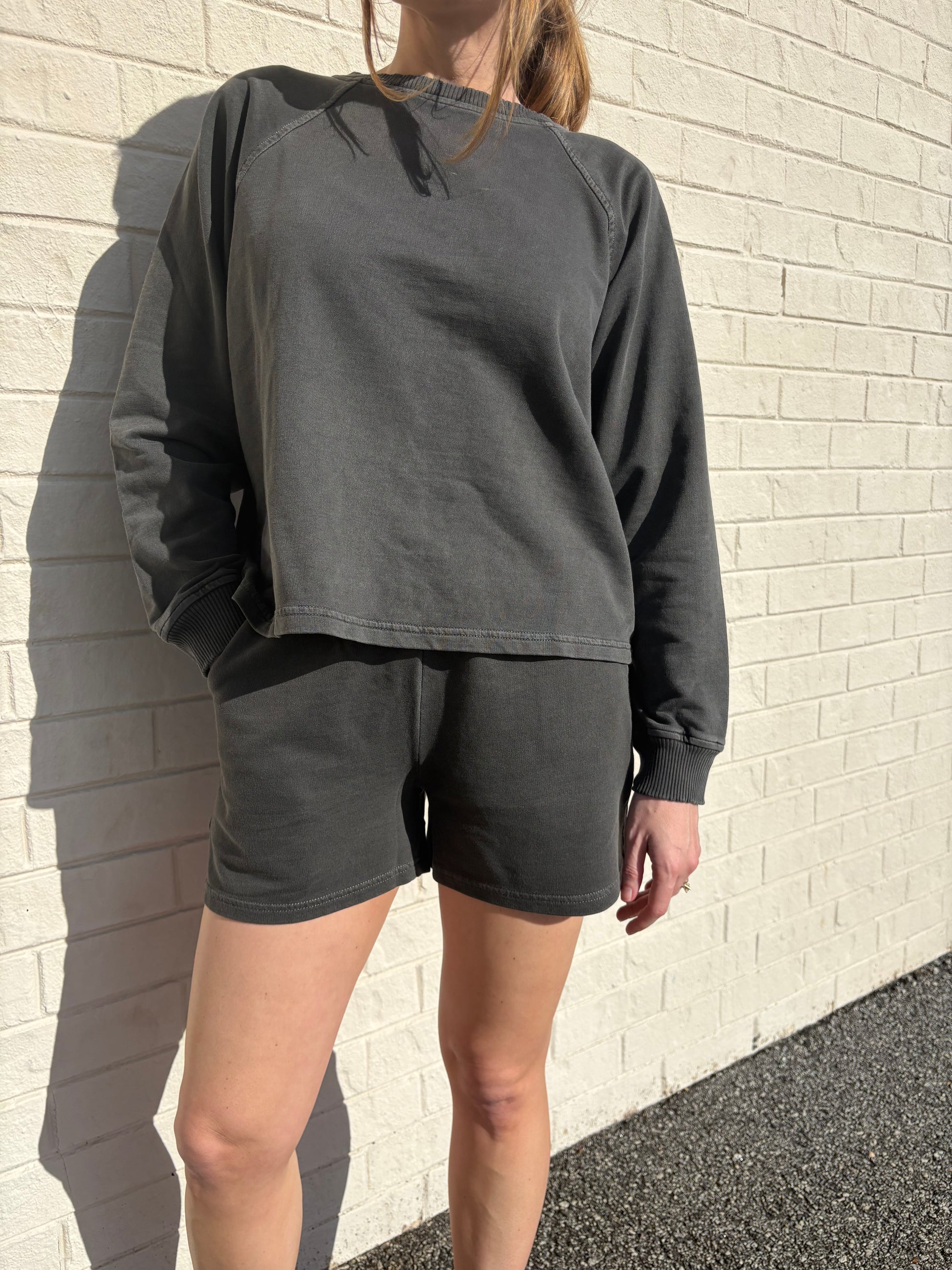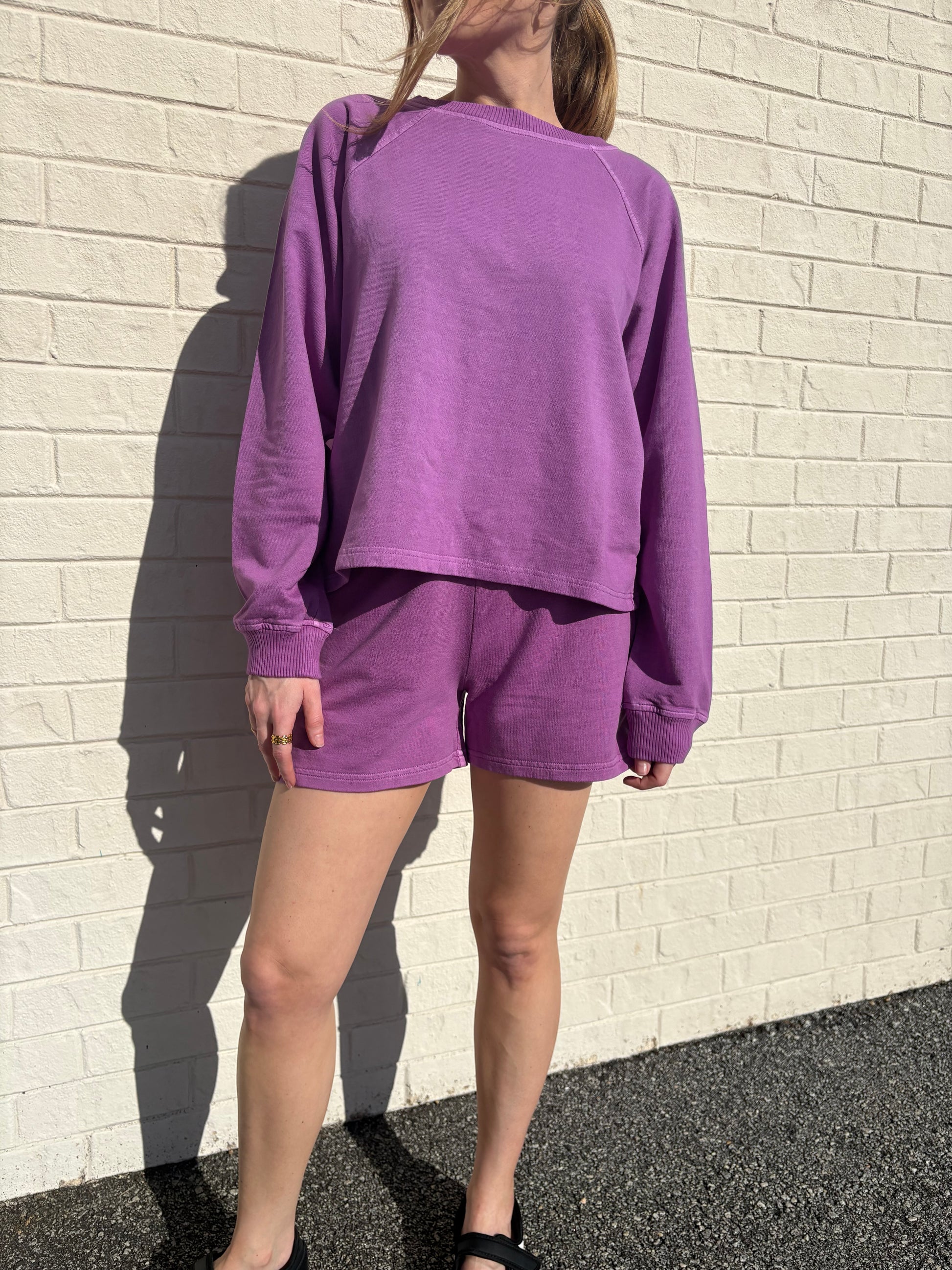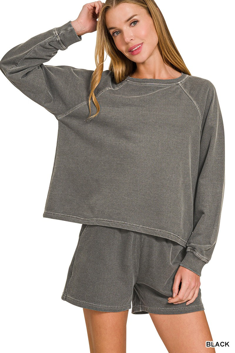 Matching set alert! French terry pigment dye and enzyme wash pullover and short set. Bottoms feature elastic waistband and side pockets.