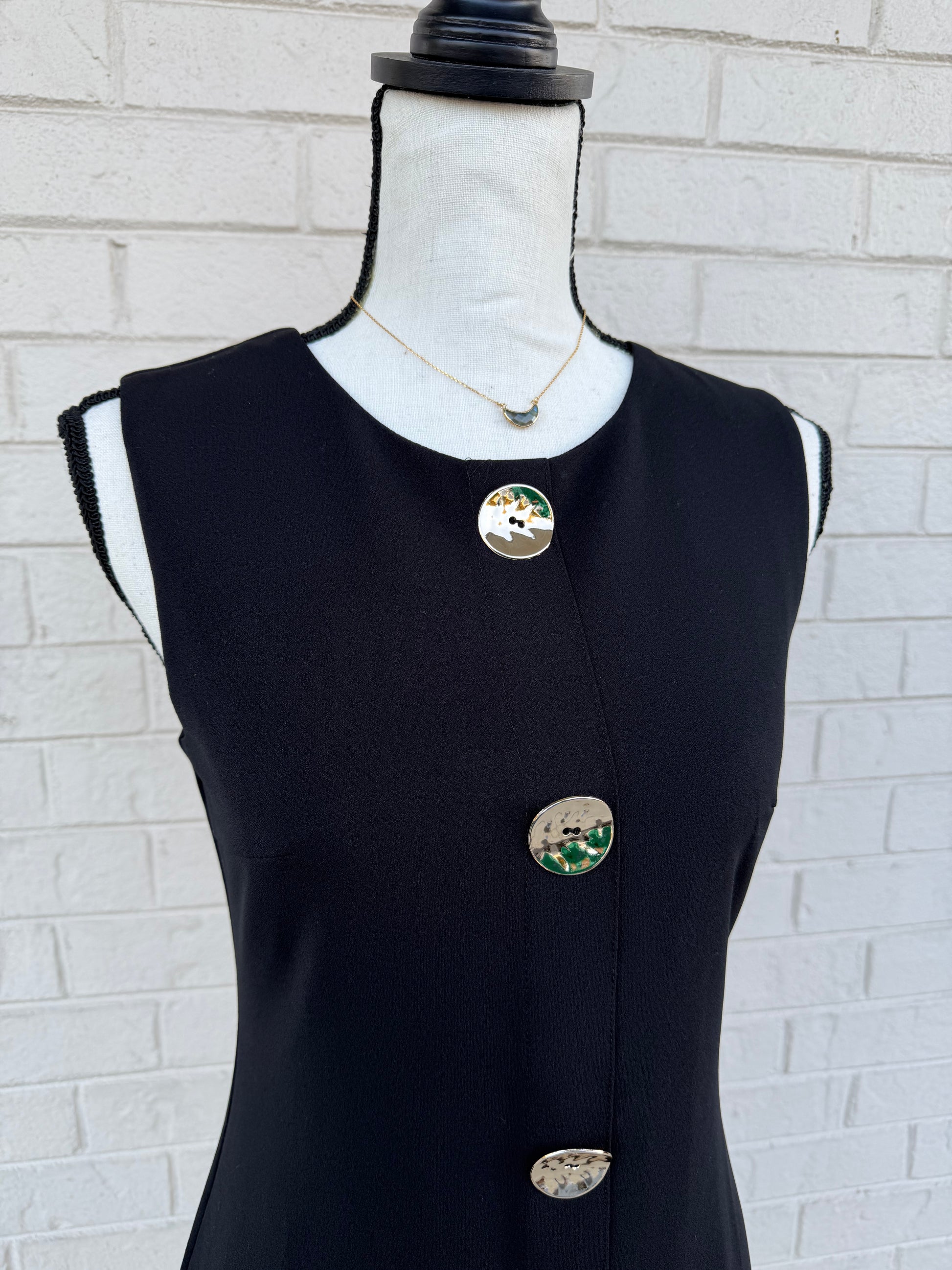 Sleeveless heavy knit button down mini dress with oversized gold buttons.