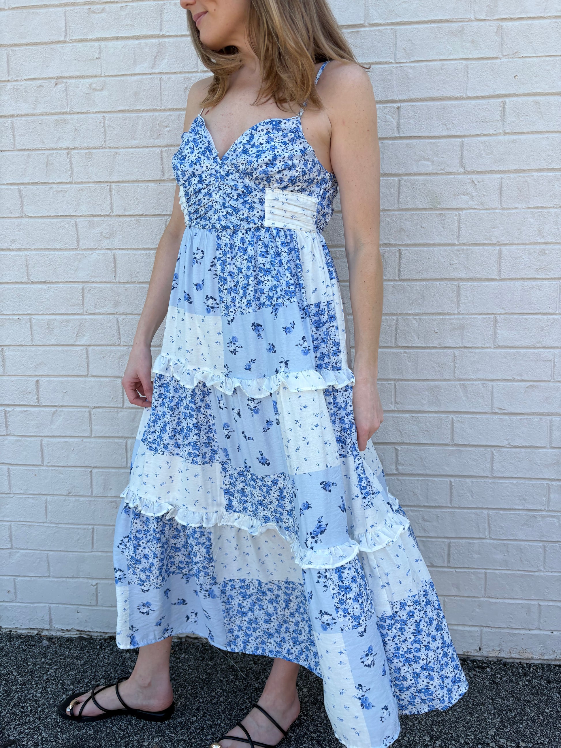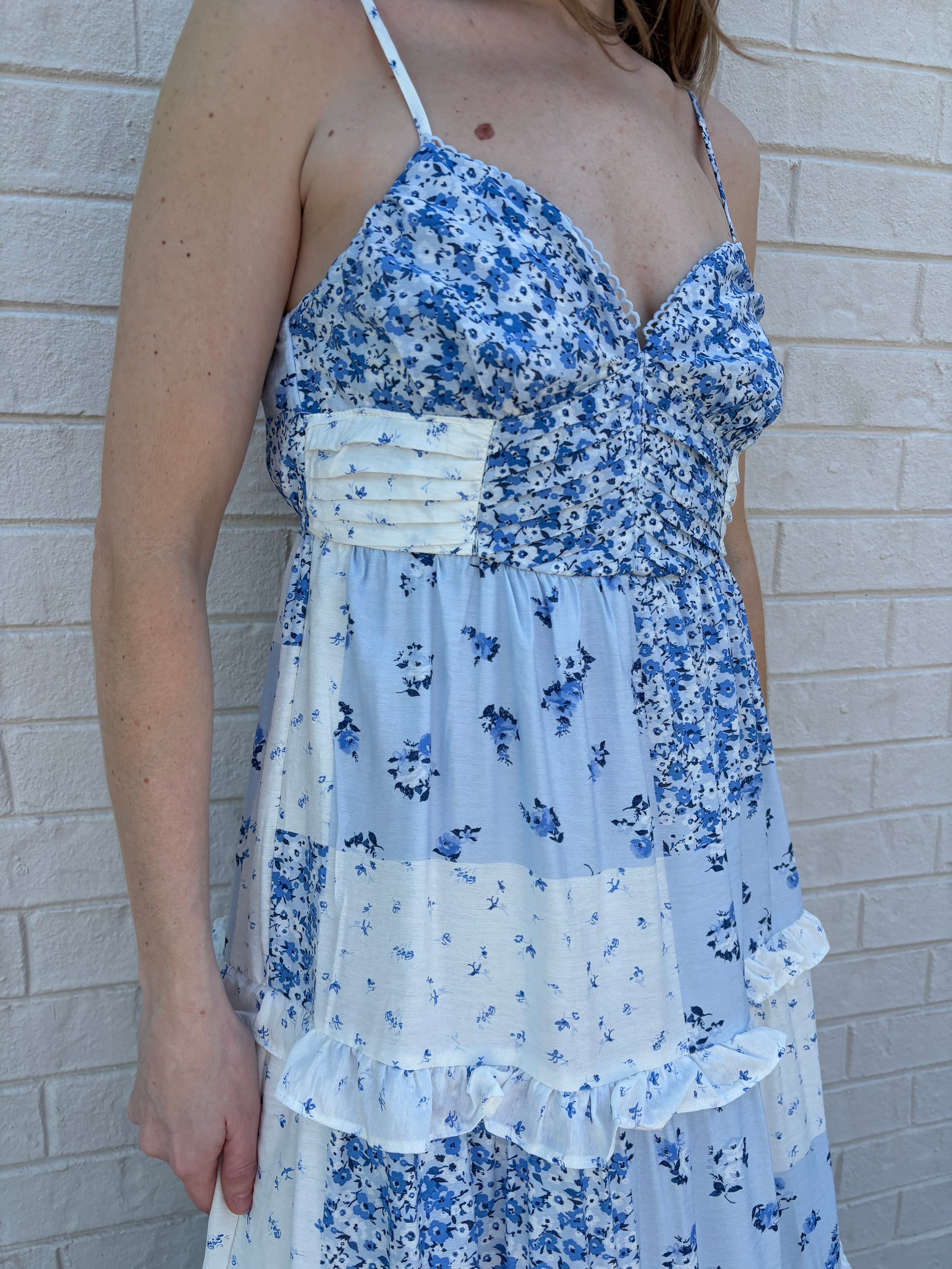 Blue midi dress with sweetheart neckline, shirred waist, smocked detail, with ruffle hem.