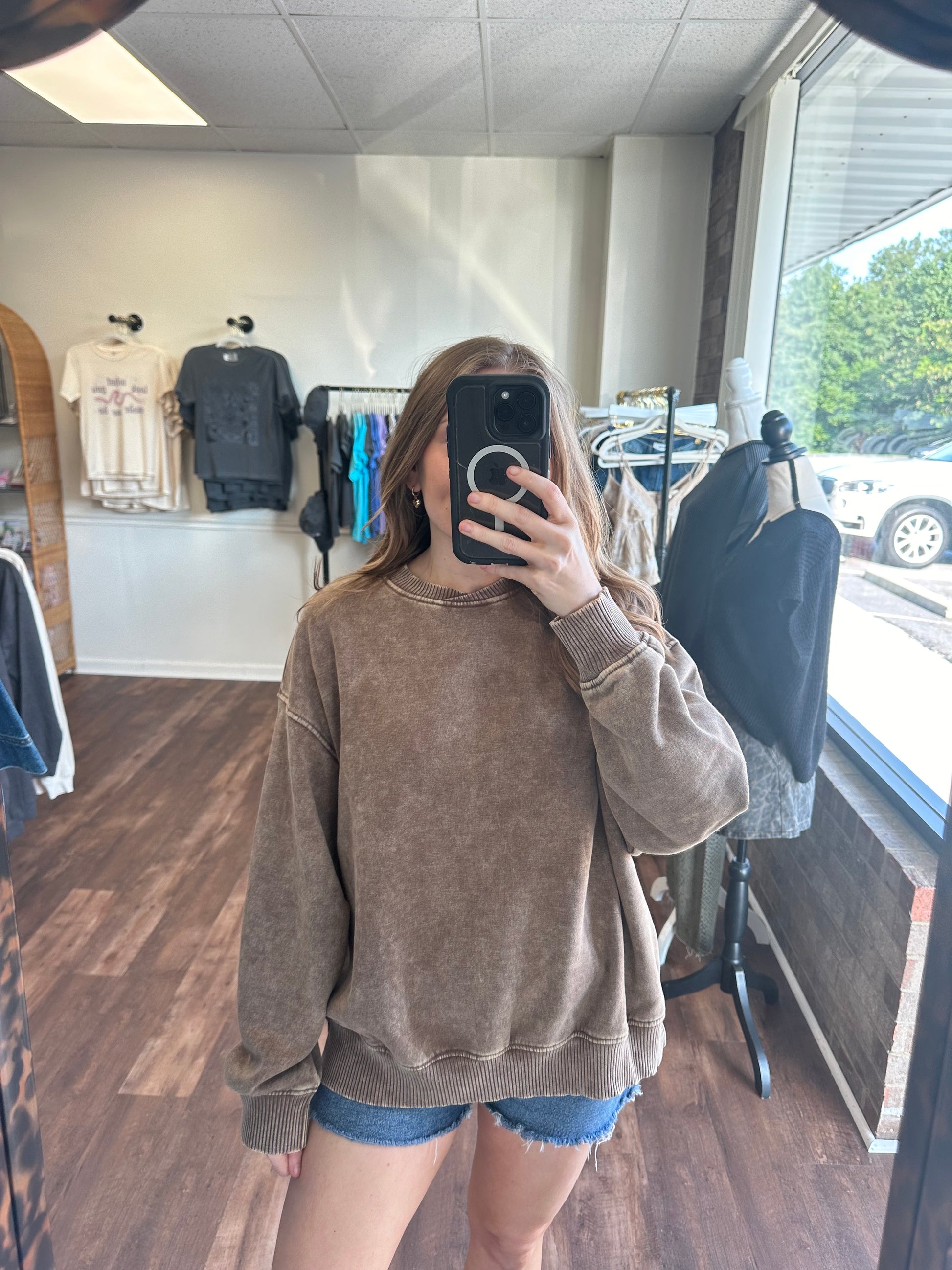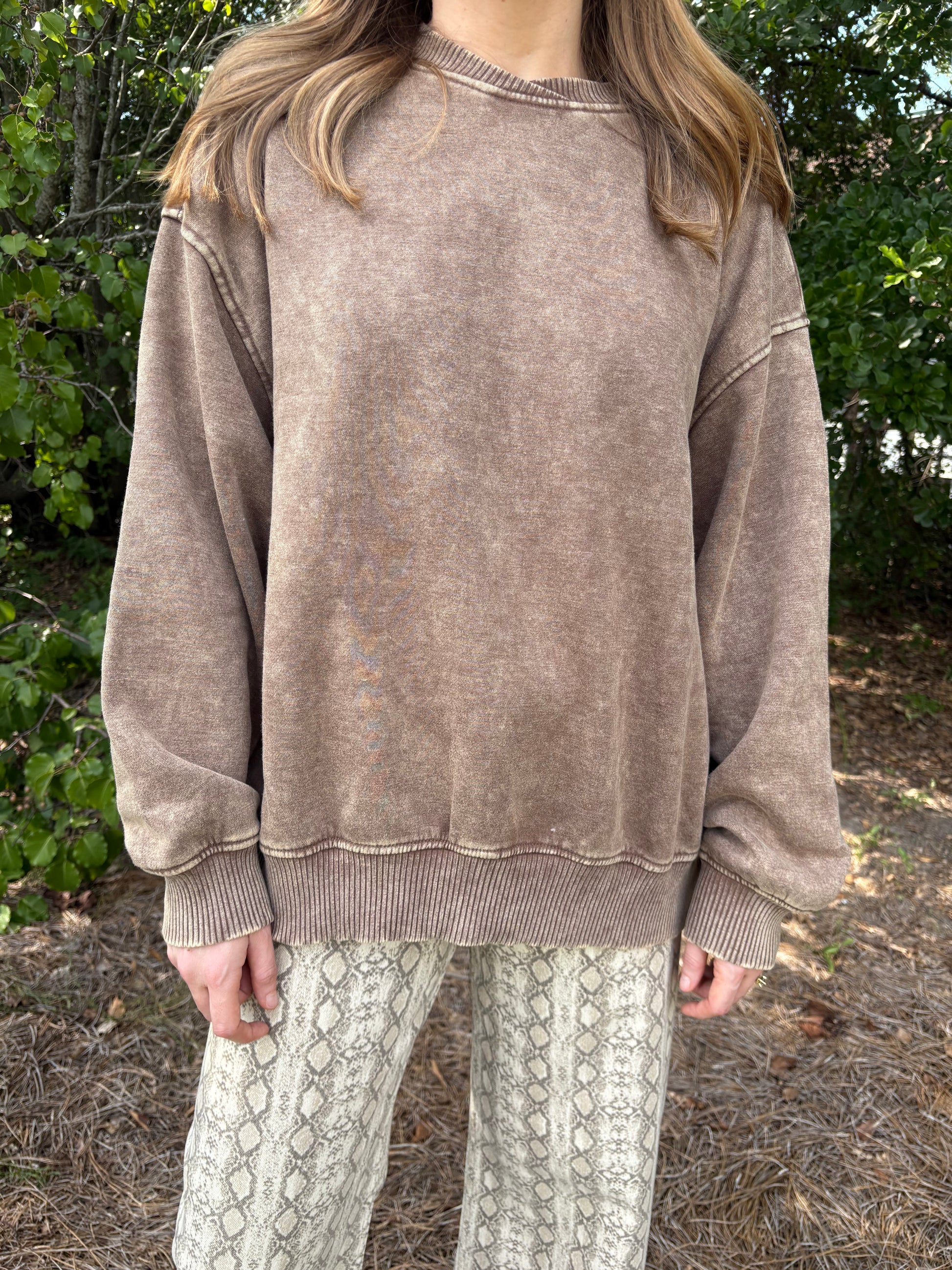 Mocha brown acid washed pullover with balloon sleeves, overlap neckband and oversized fit.