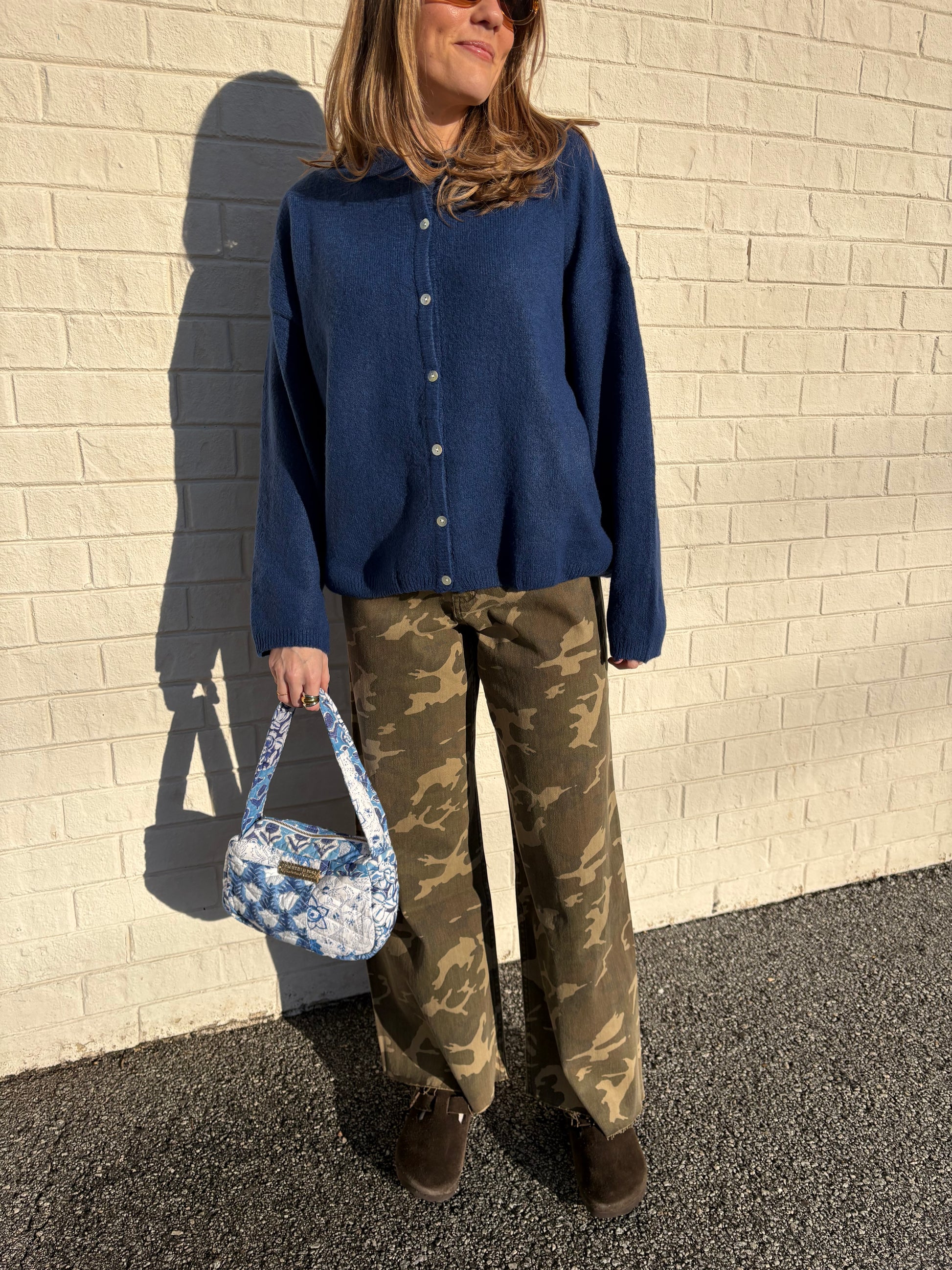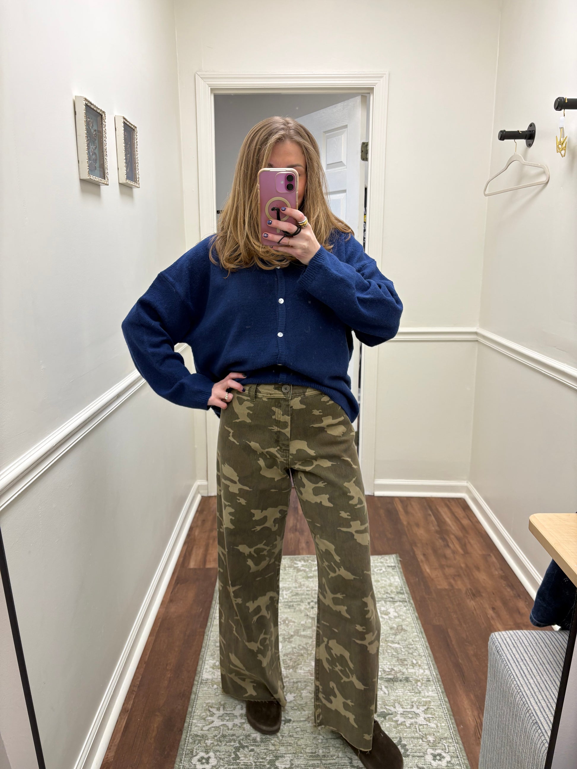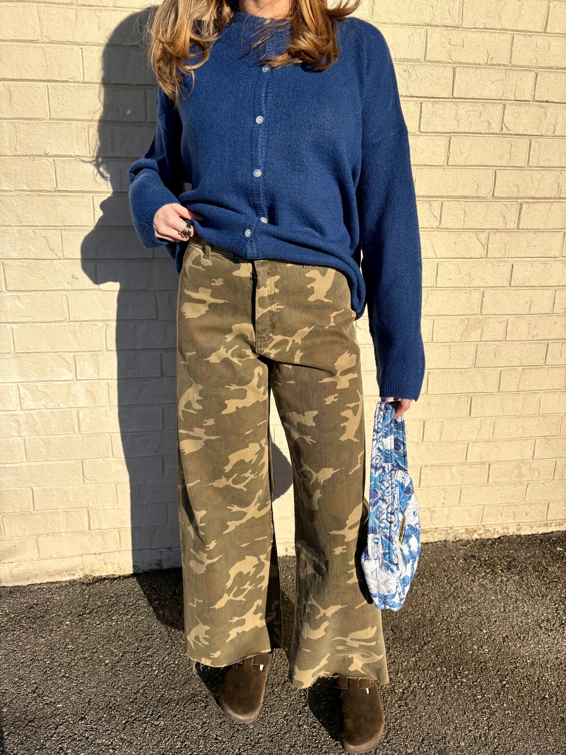 Camo denim pants featuring raw hem, back pockets, and front zipper and button closure.