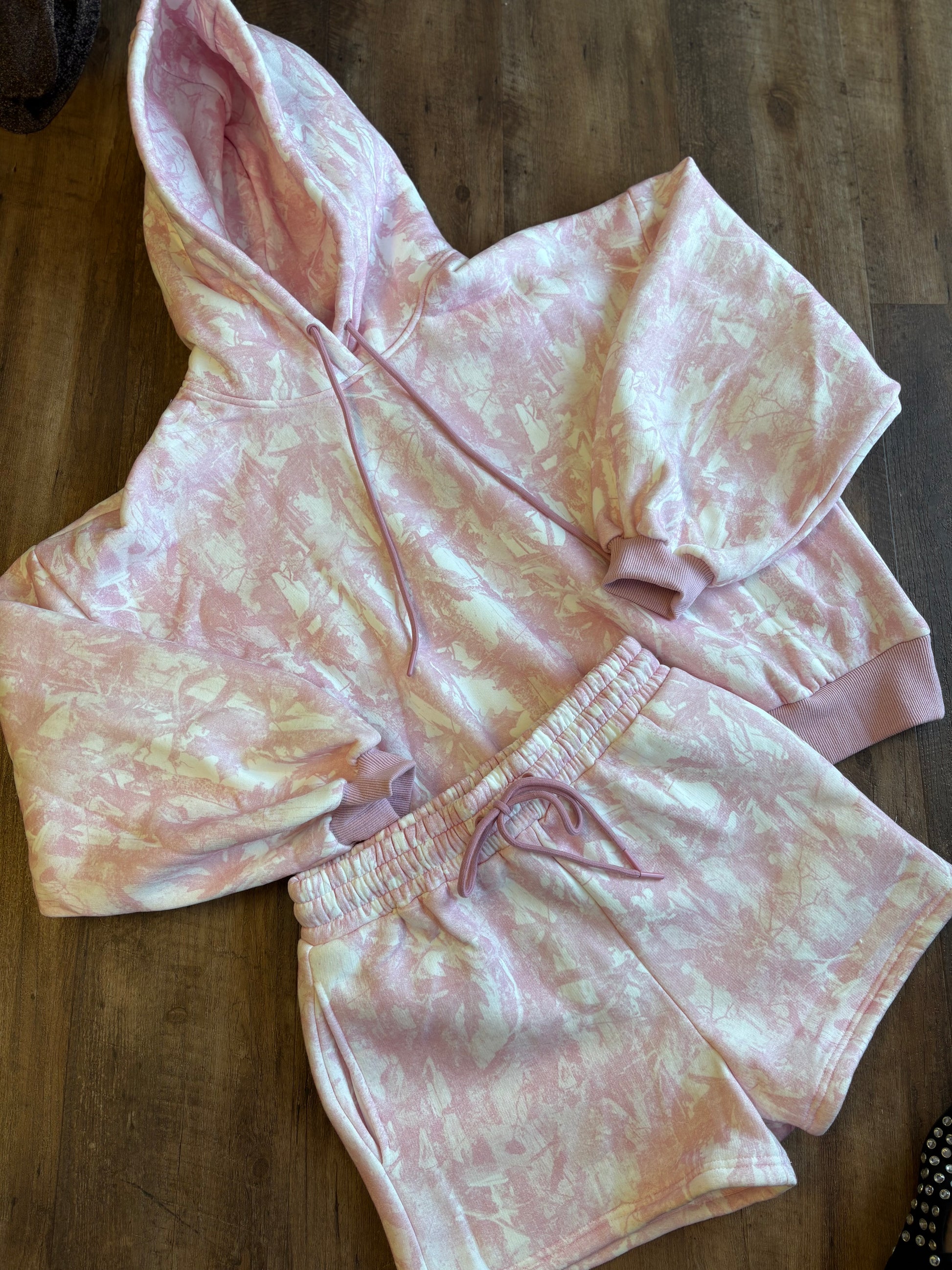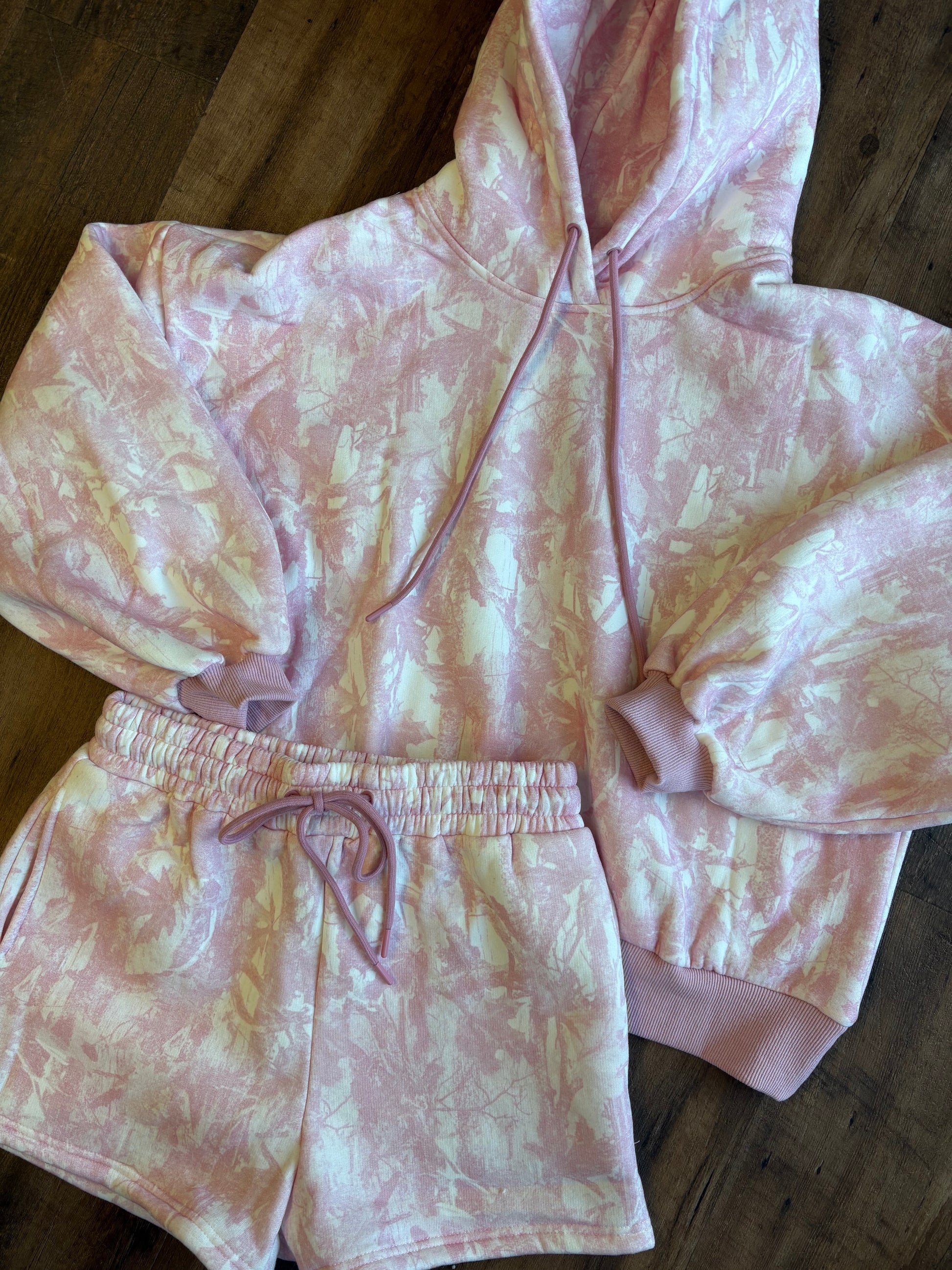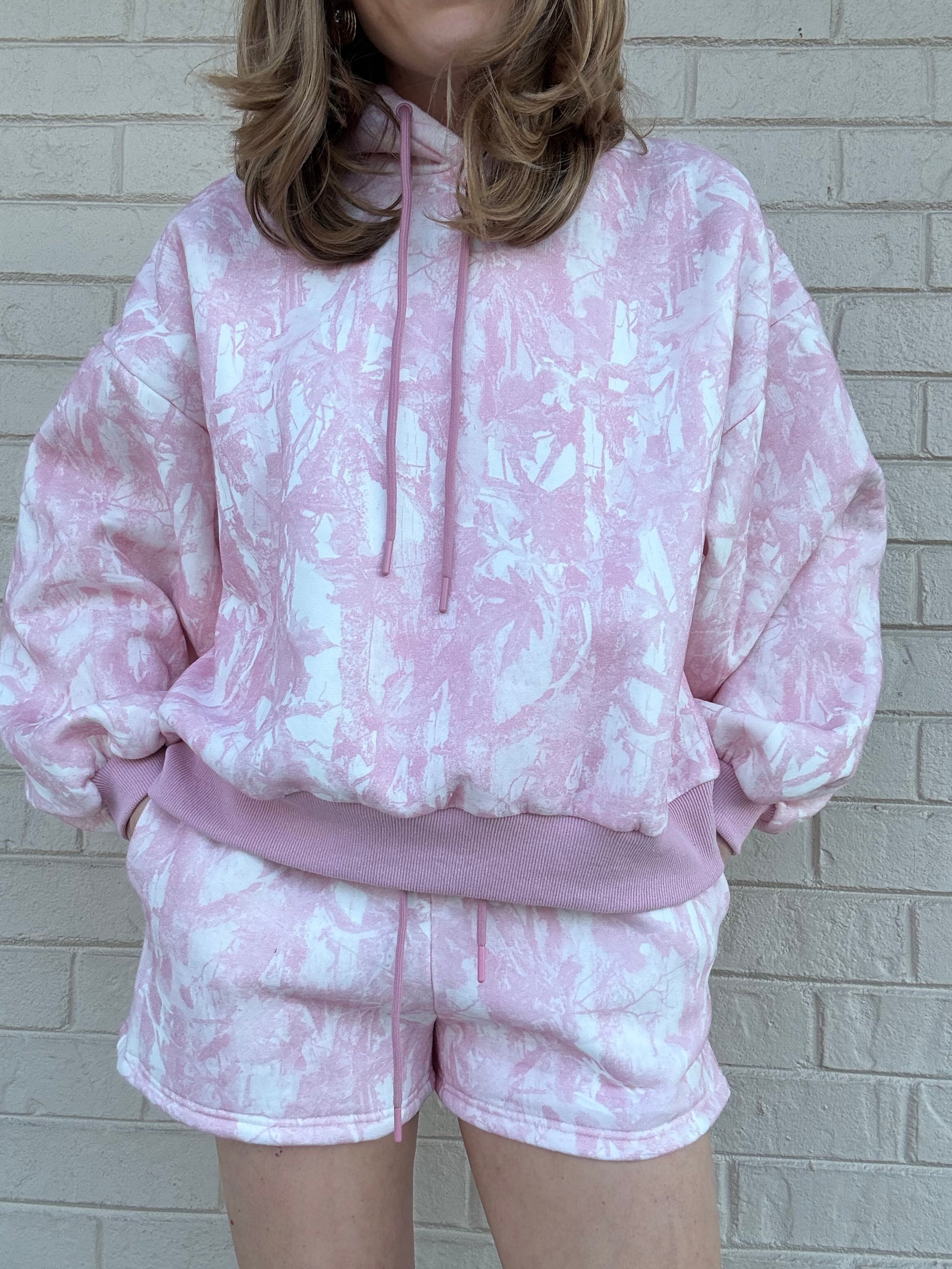 This pink camo matching set features an oversized hoodie with adjustable drawstrings, paired with coordinating shorts for the perfect loungewear look.