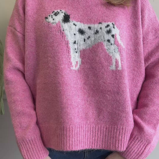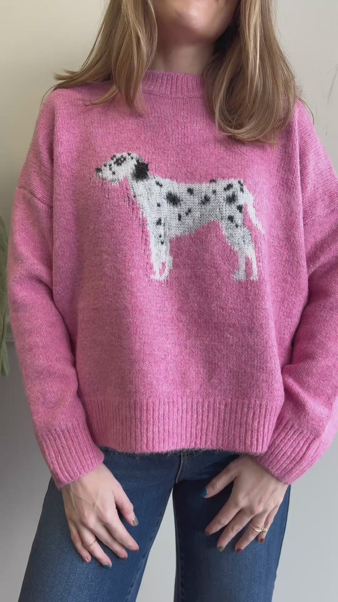 Pink, soft, relaxed fit, intentionally oversized dalmatian dog sweater.