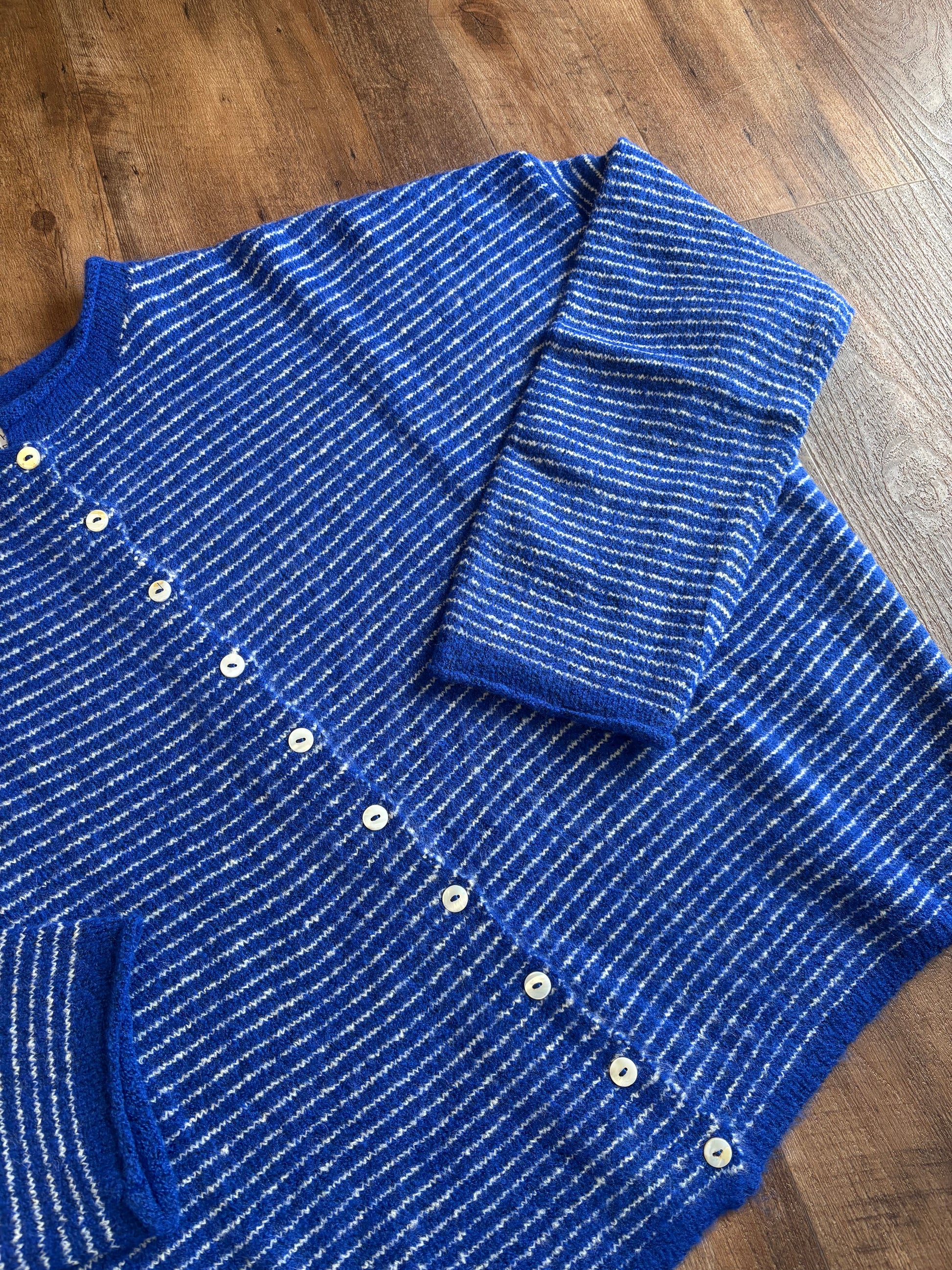 Our bestselling, lightweight, rolled neck cardigan in a pin-stripe style in royal blue!