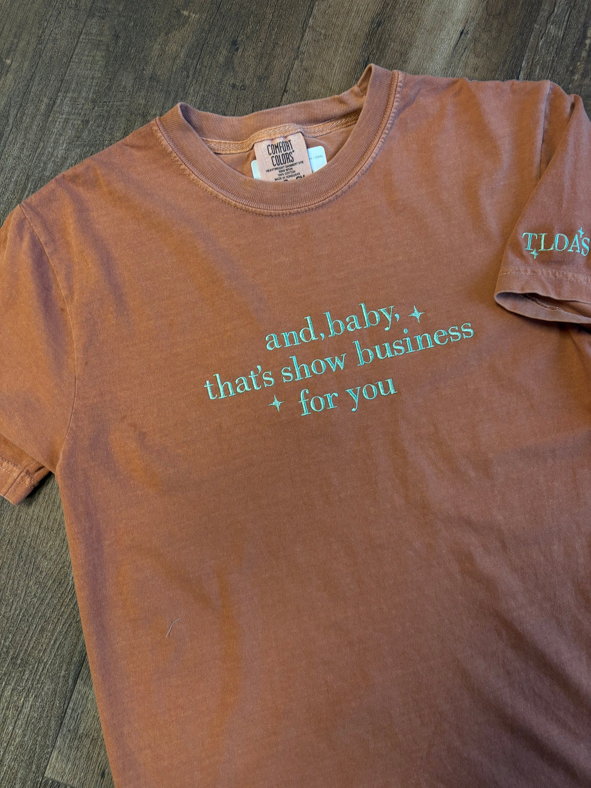 Yam with mint thread embroidered comfort colors tee. Features embroidered text “and baby, that’s show business for you” on front and “TLOAS” on sleeve.