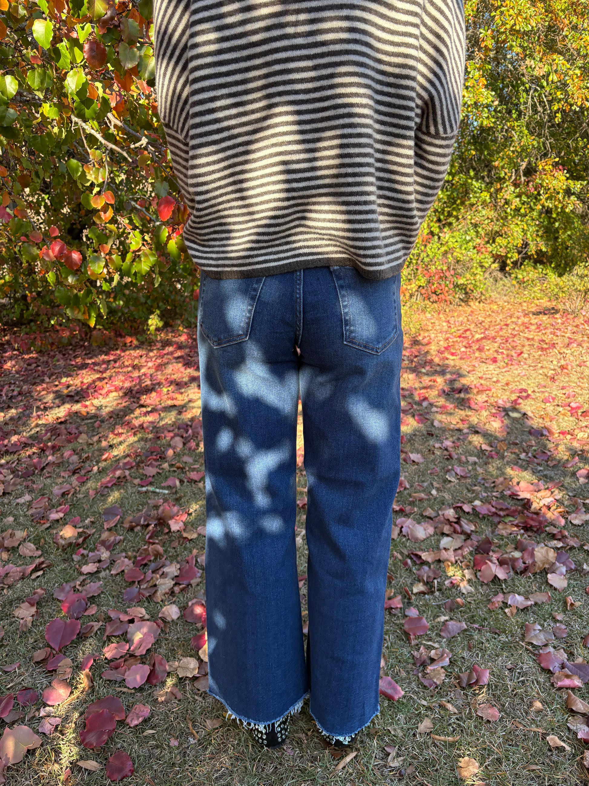 This high-rise slim wide-leg jean in dark denim blends a sleek, tailored fit with an edgy twist. The slim profile through the hips and thighs balances the wide-leg cut, while the scissor-cut hem delivers a contemporary, unfinished touch. 10.5'' RISE, 27'' INSEAM 93% COTTON, 5% POLYESTER, 2% SPANDEX Model: Height 5' 9", Size 26