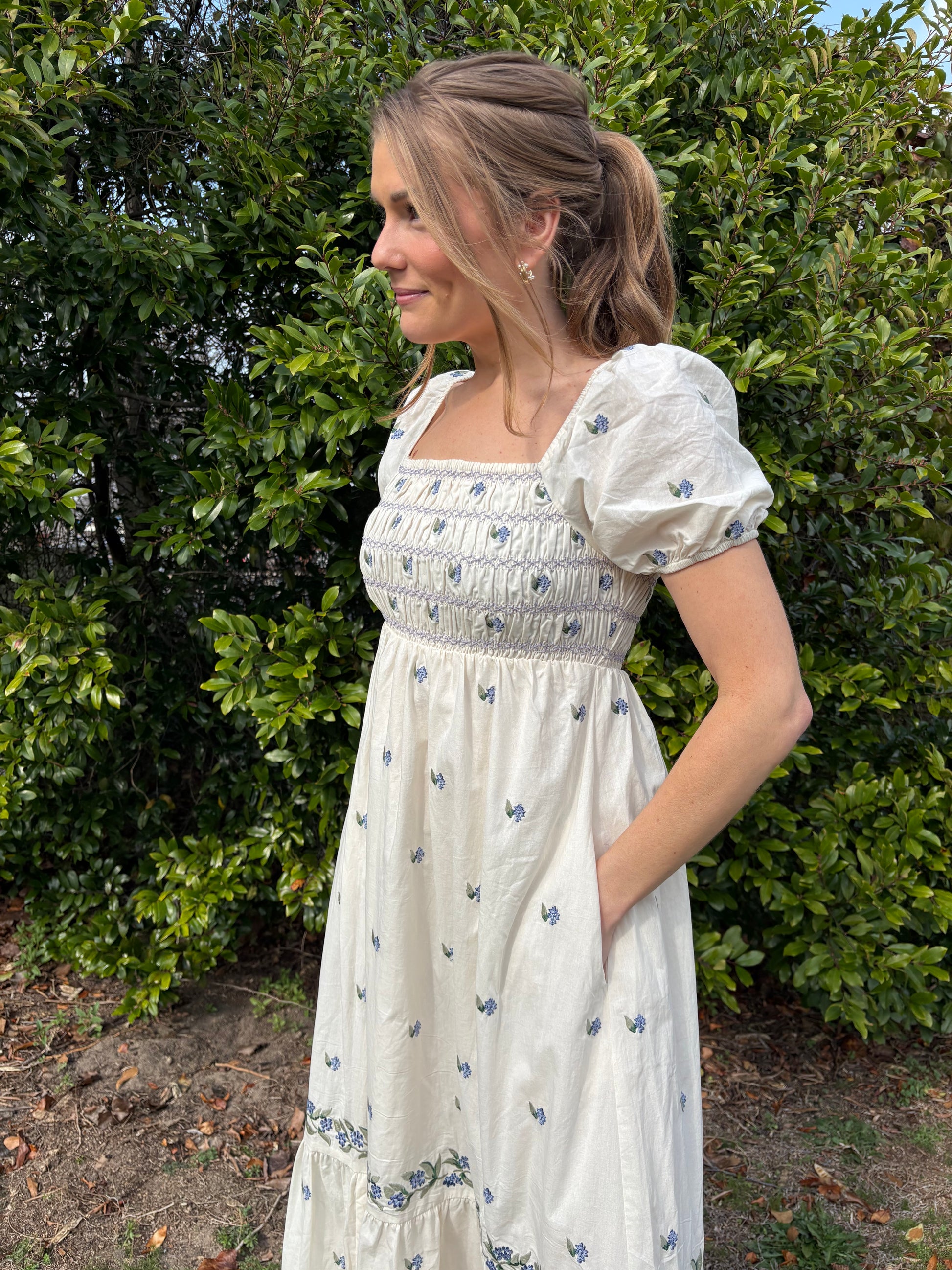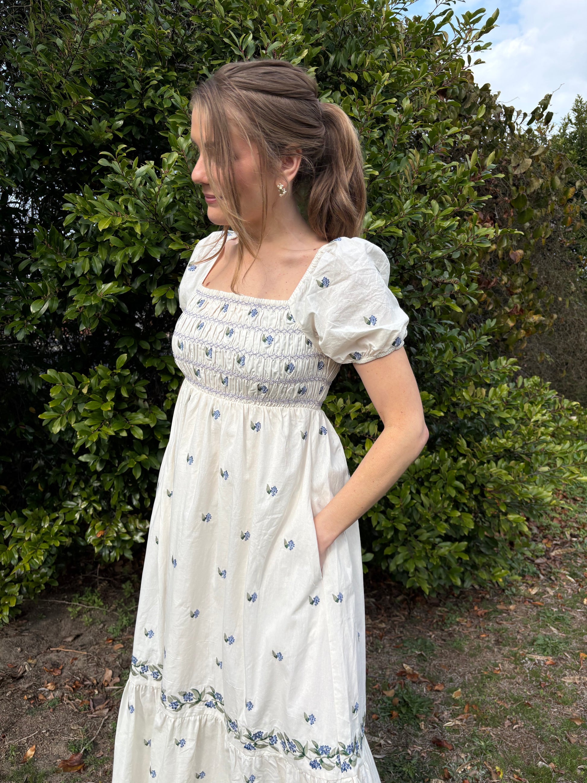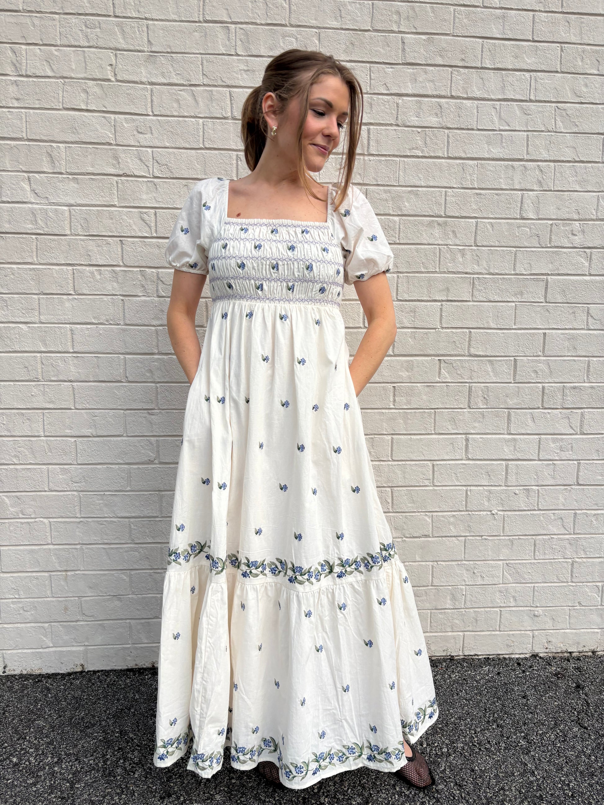 Off white cotton maxi dress with blue floral embroidery! We love the smocked bodice, tiered skirt, elastic puff sleeves, and side pockets. Fully lined!