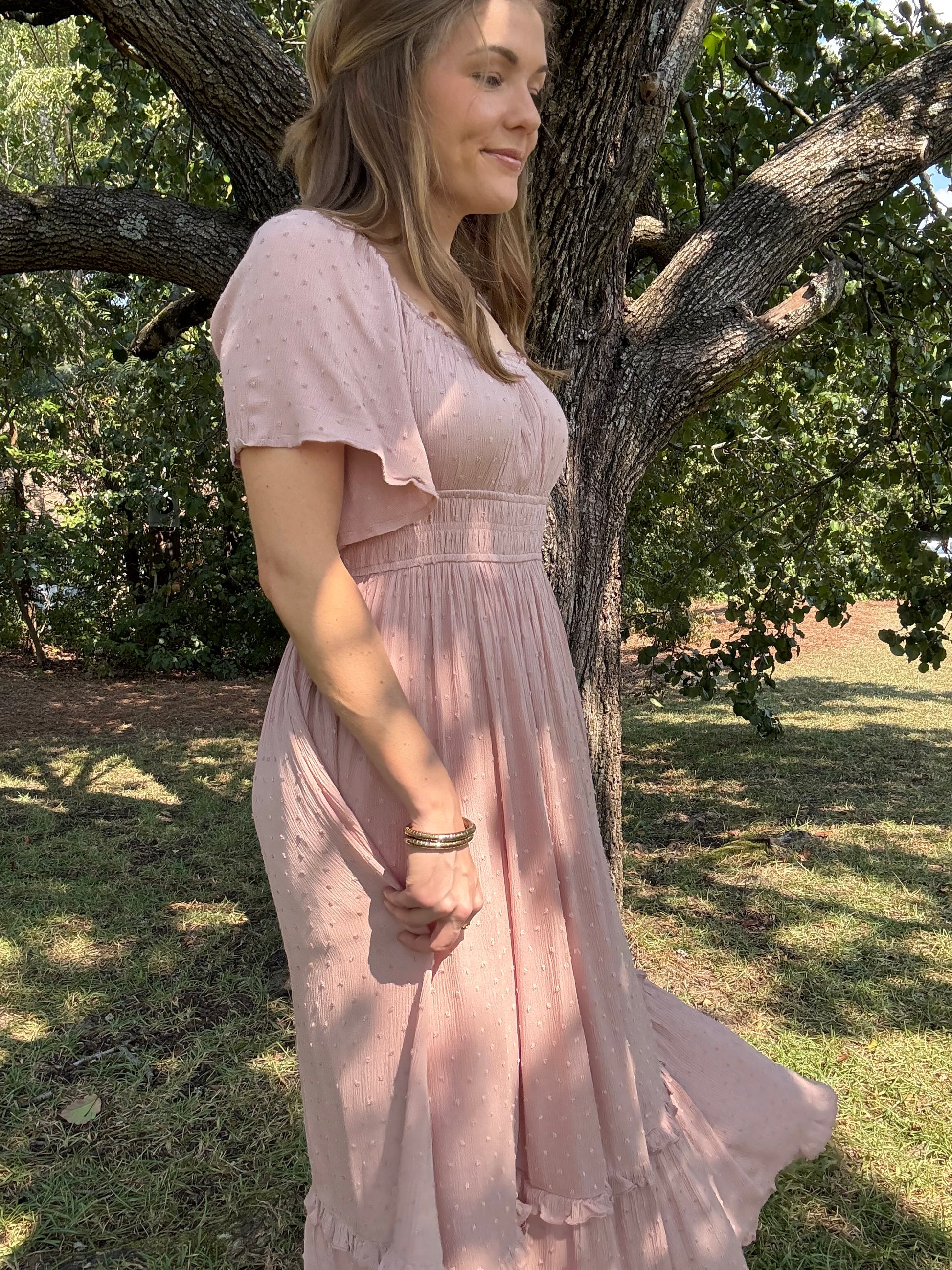 Swiss Dot Flutter Sleeve Maxi in tea rose.
