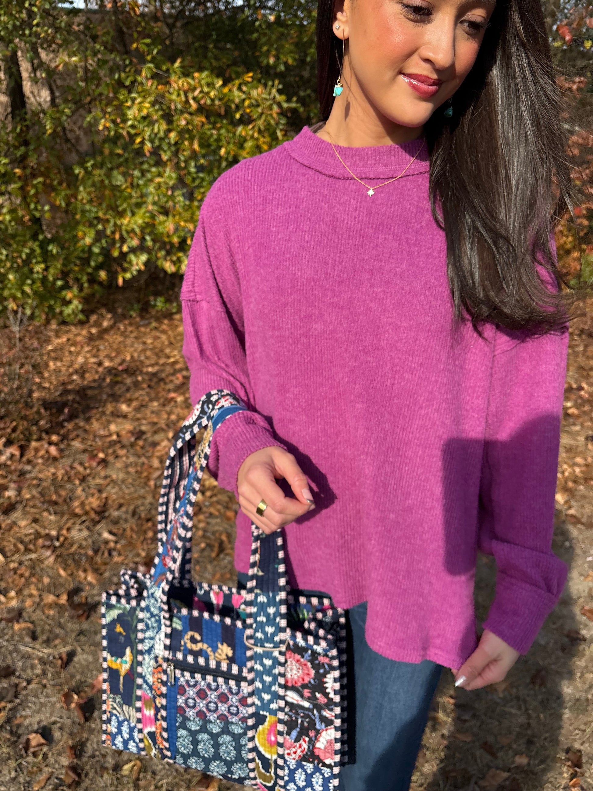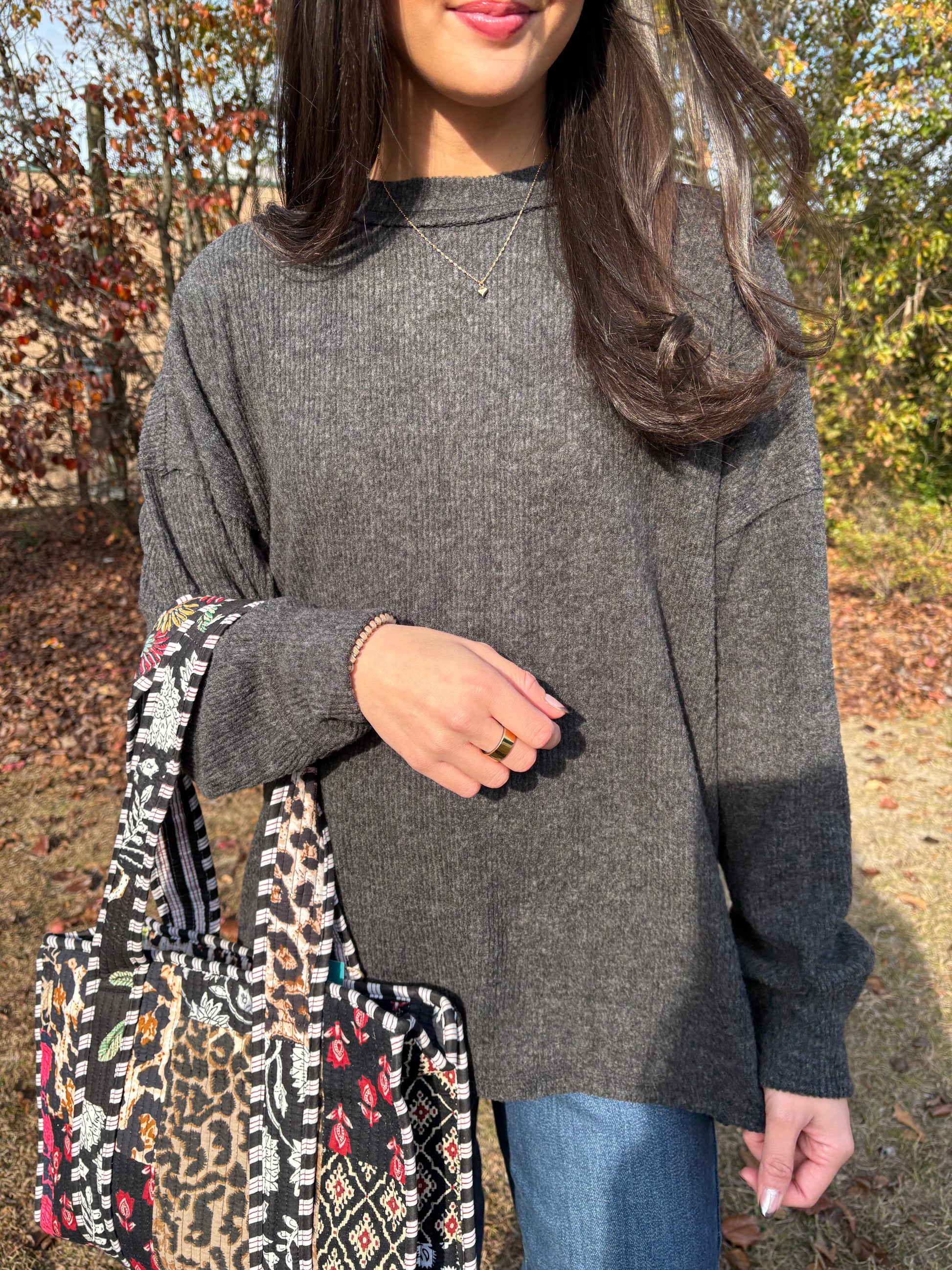 SOFT AND LIGHTWEIGHT SWEATER. Brushed ribbed exposed seam drop shoulder sweater with high-low hem, side slits, and exposed seam. Available in ash mocha, black, or plum!