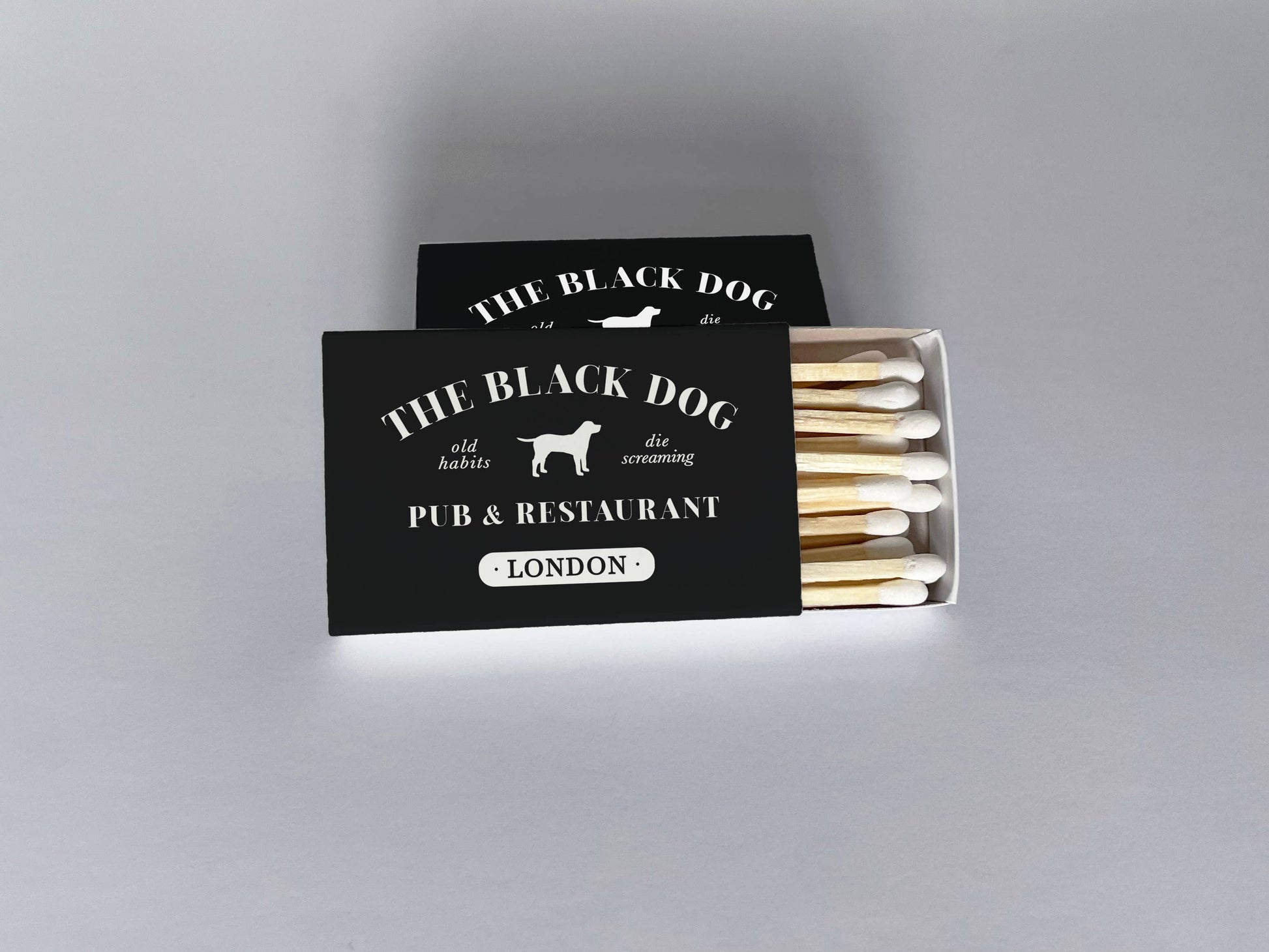 Light up any moment with these handmade matchbooks, designed to spark conversation as much as candles. 'The Black Dog'. There is also a small dog icon with a solid black background. The box is sized to 2.25"L x 1.38"W x .38"H. Each box is made of cardboard and contains 18 white-tipped wooden matches with a match starter on one side.