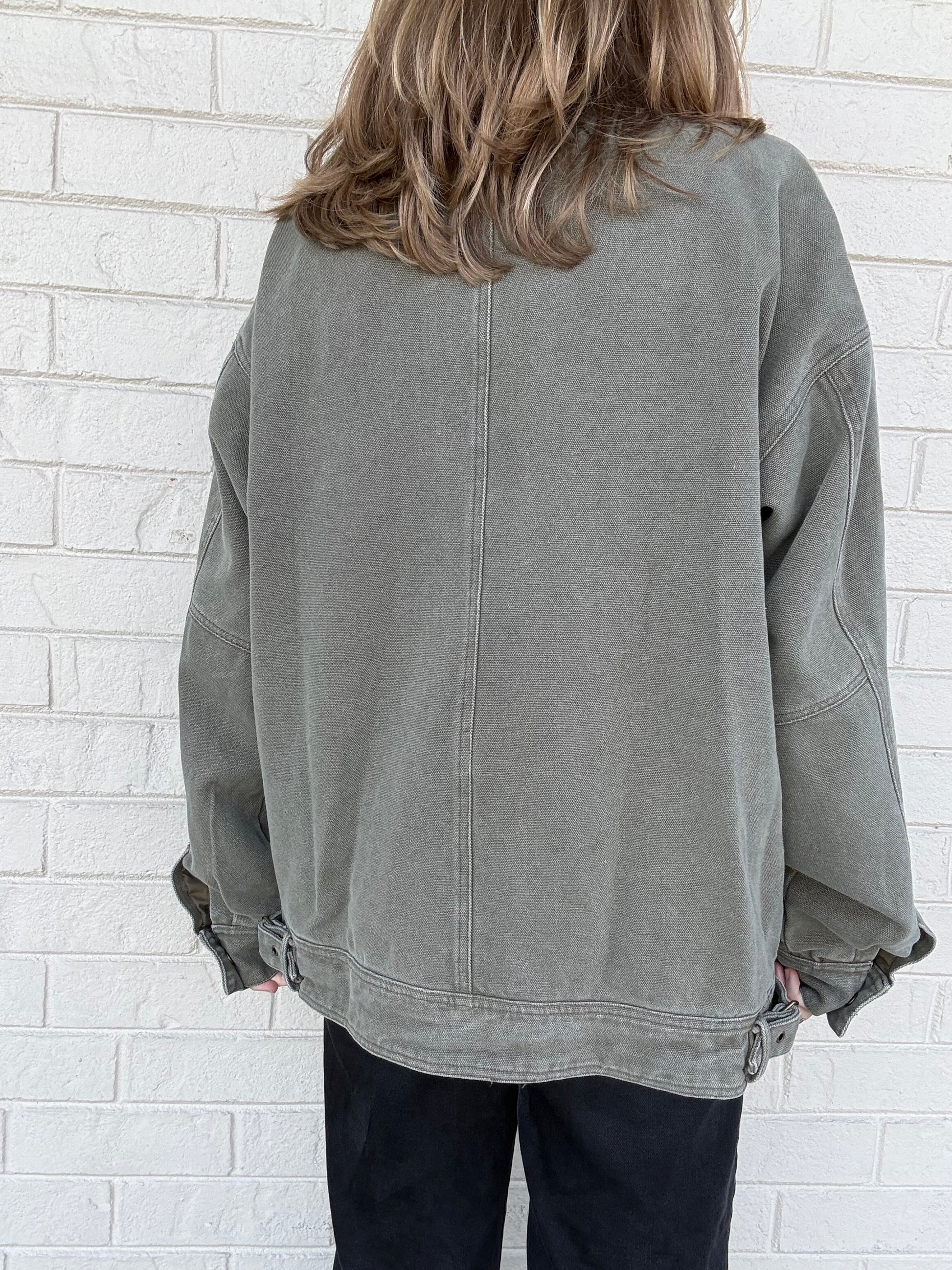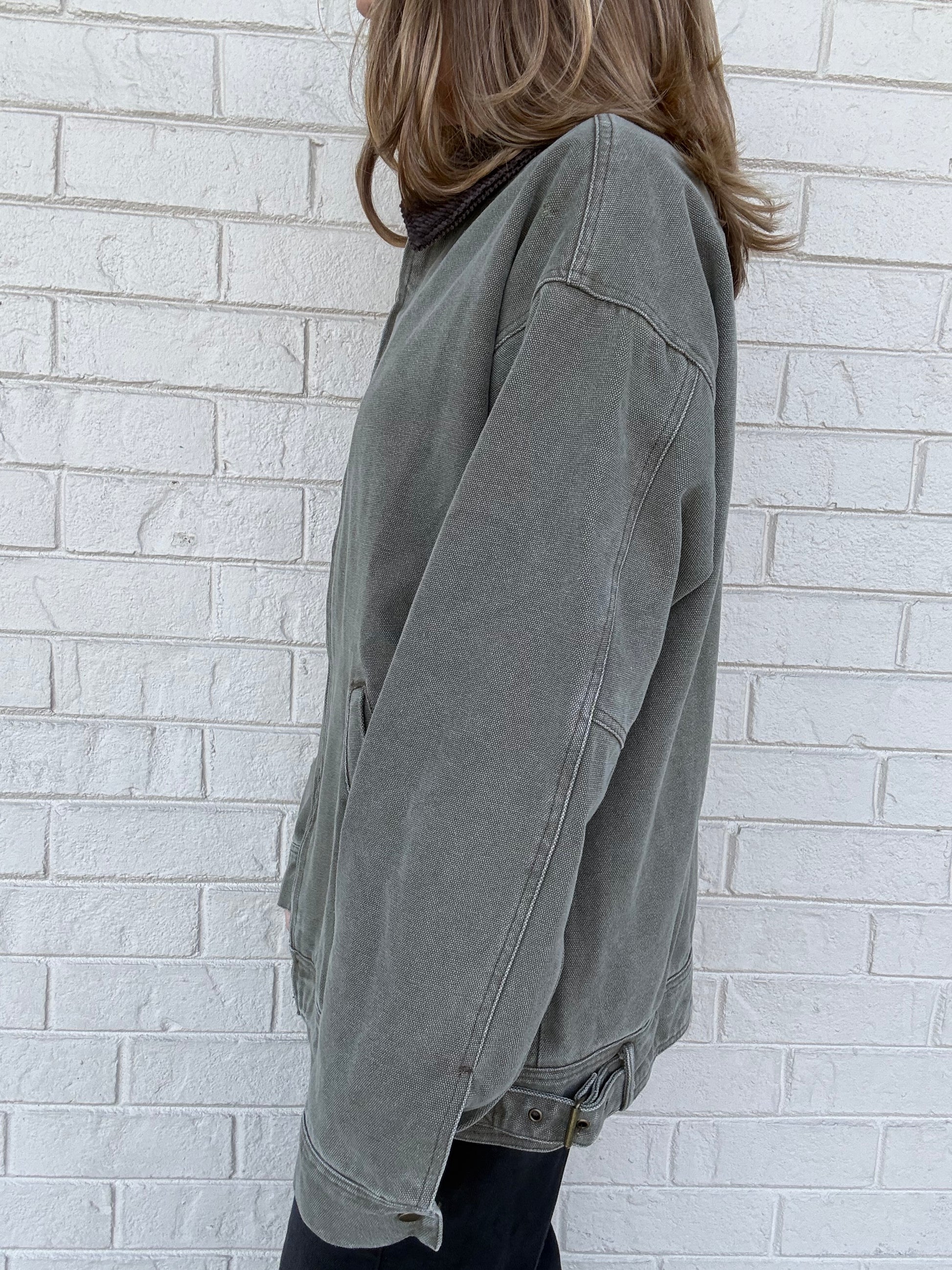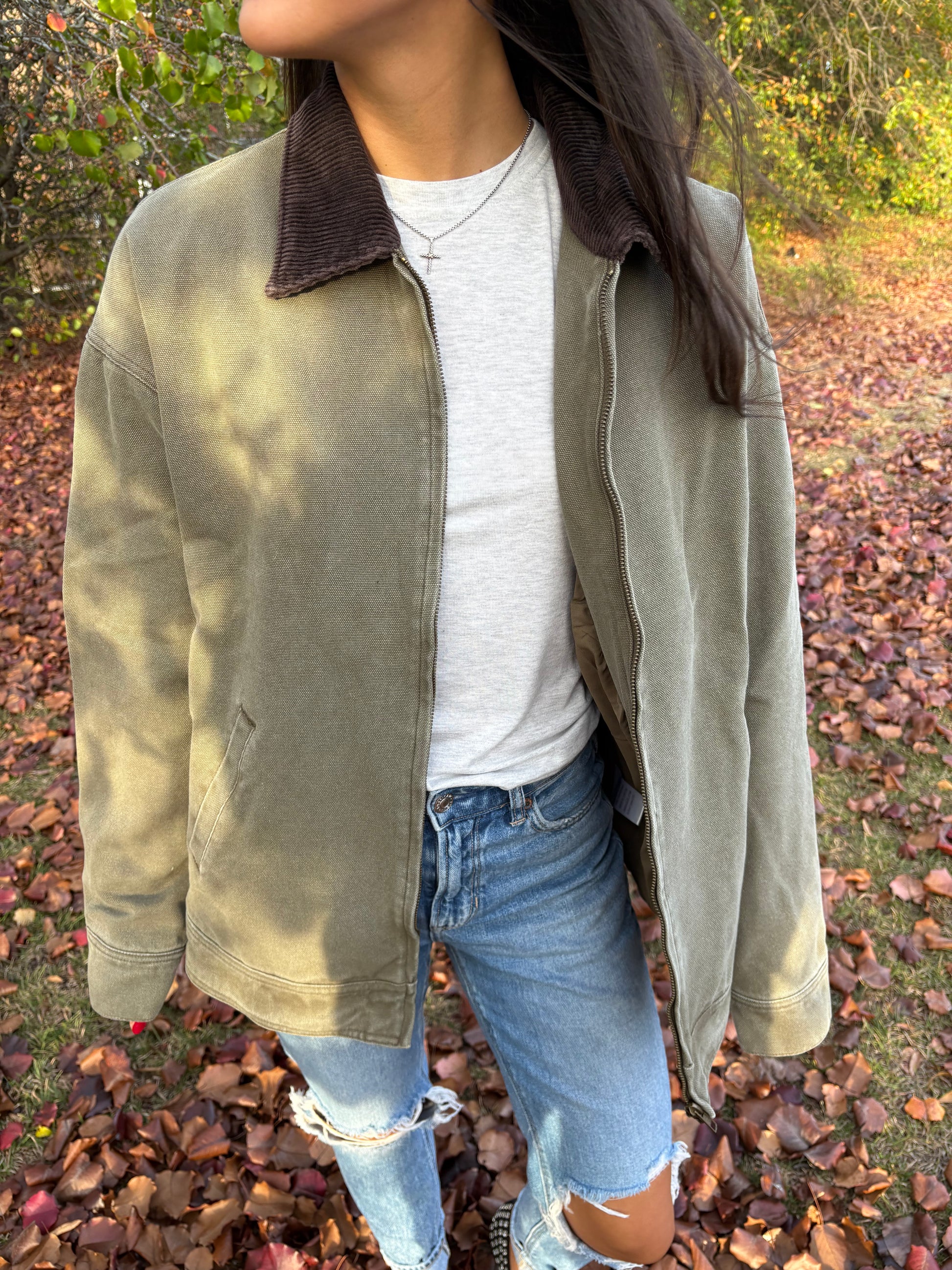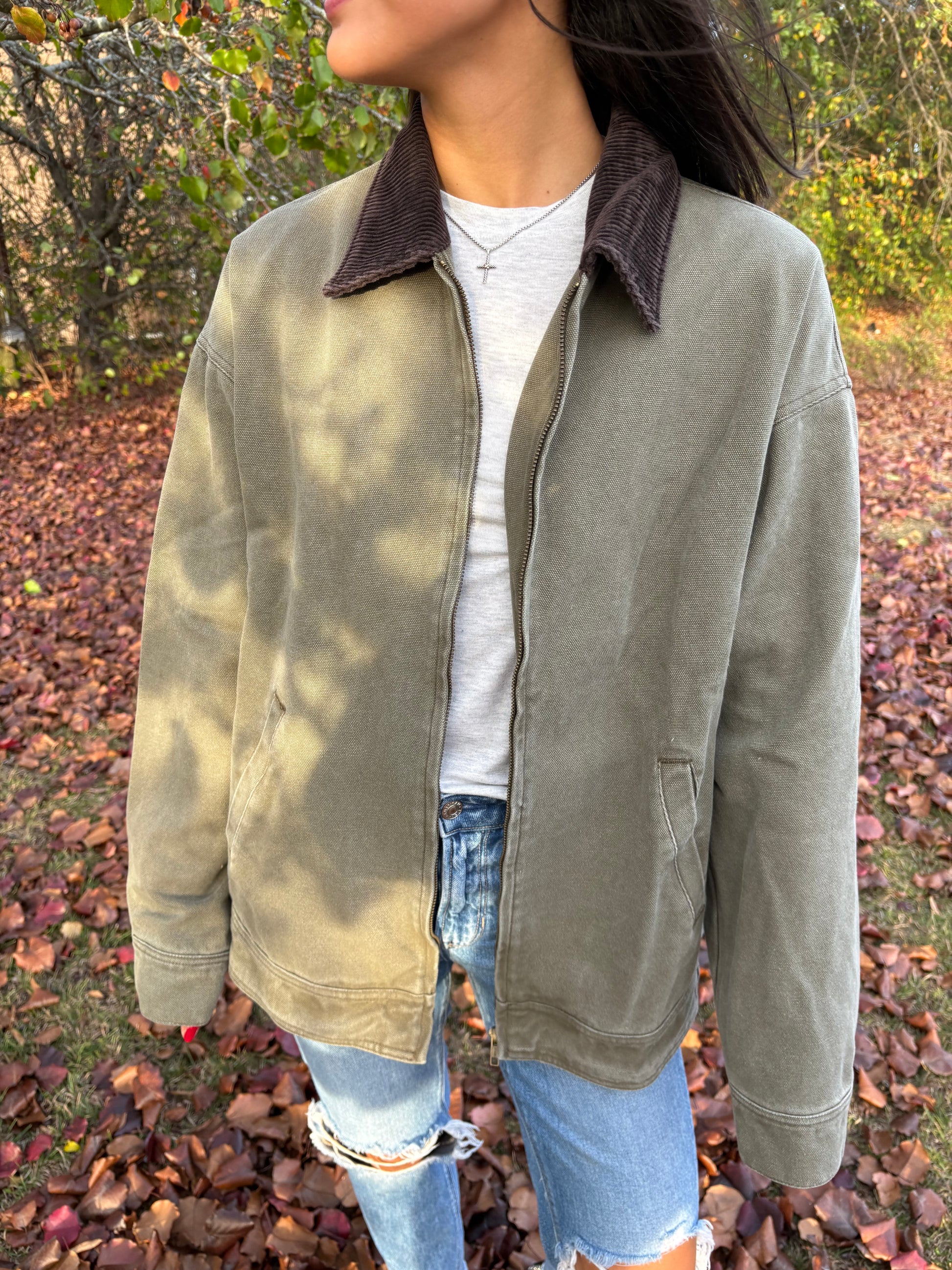 Olive barn jacket with brown corduroy contrasting color, side pockets.